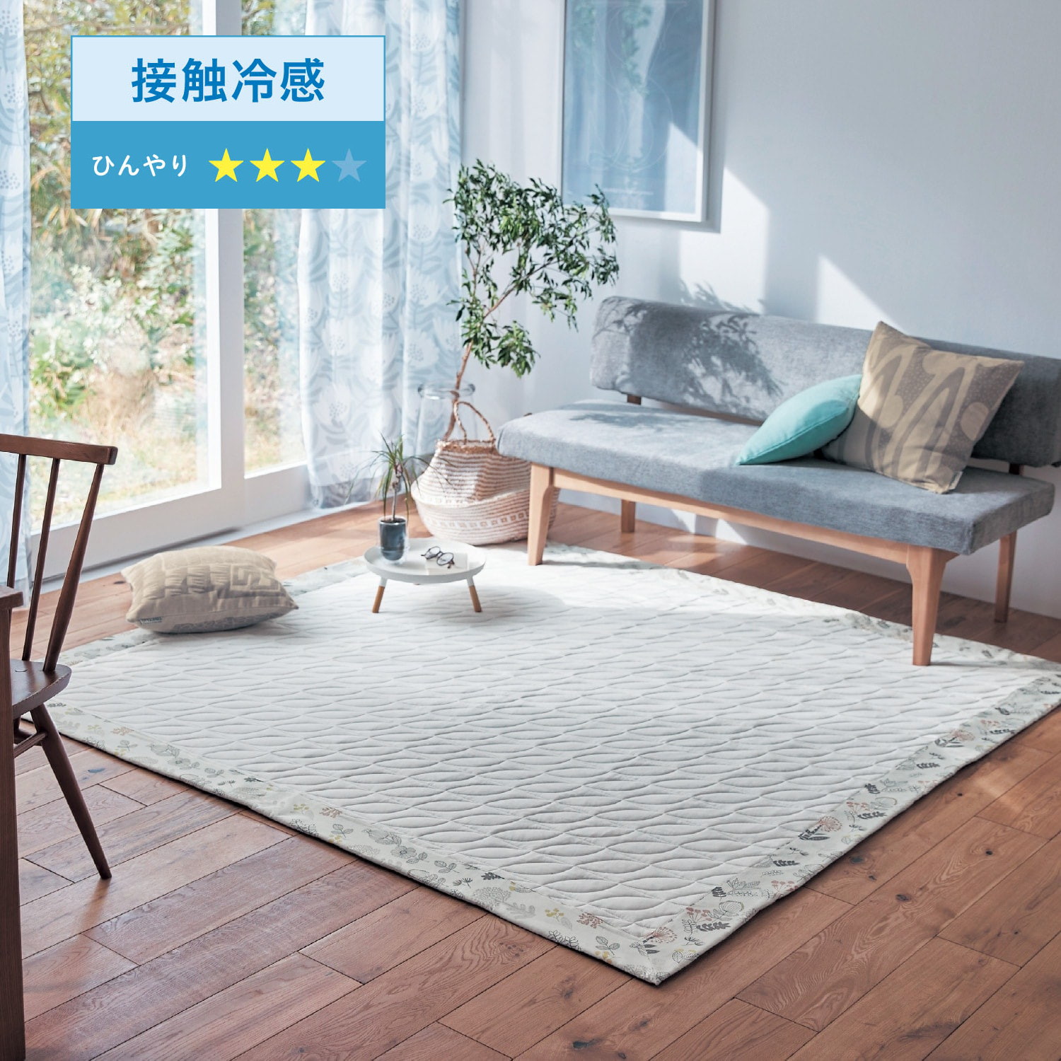 ーデザイン・スタイリングーリーフ調のキルトステッチと縁どりの植物柄が涼し気北欧調インテリアにも素敵にマッチー素材ー表面は触れると冷たく感じる接触冷感素材を使用ふんわりとした座り心地の中わた入り裏面は床を傷つけにくい不織布仕様ー機能ー汚れたら家庭で丸洗いOK裏面にゴムバンド付きアンダーラグと一緒に使うとさらに快適接触冷感レベル本商品の触れた瞬間のひんやりレベルは・・・【「適度なひんやり」ひんやり】
