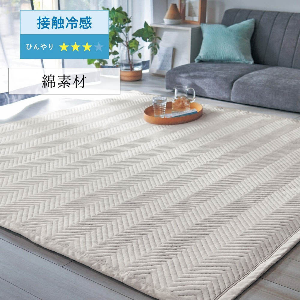 表地は綿100%素材でさらりとした肌触り綿素材なのにほどよい接触冷感性もあり綿ならではの吸水性があり、暑い季節もさっぱりした肌ざわり表地も中わたも吸水速乾性があり、洗濯しても乾きやすく、汚れてもこまめに洗って清潔さをキープできるシンプルなキルトラインとくすみカラーは、どんなお部屋の雰囲気にもマッチ4隅はずれ防止バンド付きで別売りのアンダーラグと組み合わせての使用もおすすめ接触冷感レベル本商品の触れた瞬間のひんやりレベルは・・・【「適度なひんやり」ひんやり】