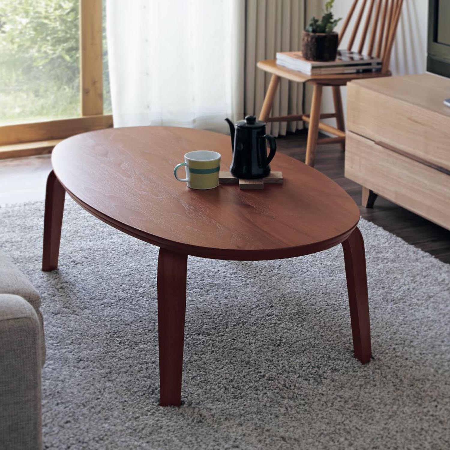 天然木の突板を使用し、天板や曲げ木の脚などフォルムにこだわったカフェテーブル風デザインオフシーズンにはソファーと合わせてもおしゃれに使えます。だ円形はスリムな奥行なのでスペースをとりません)