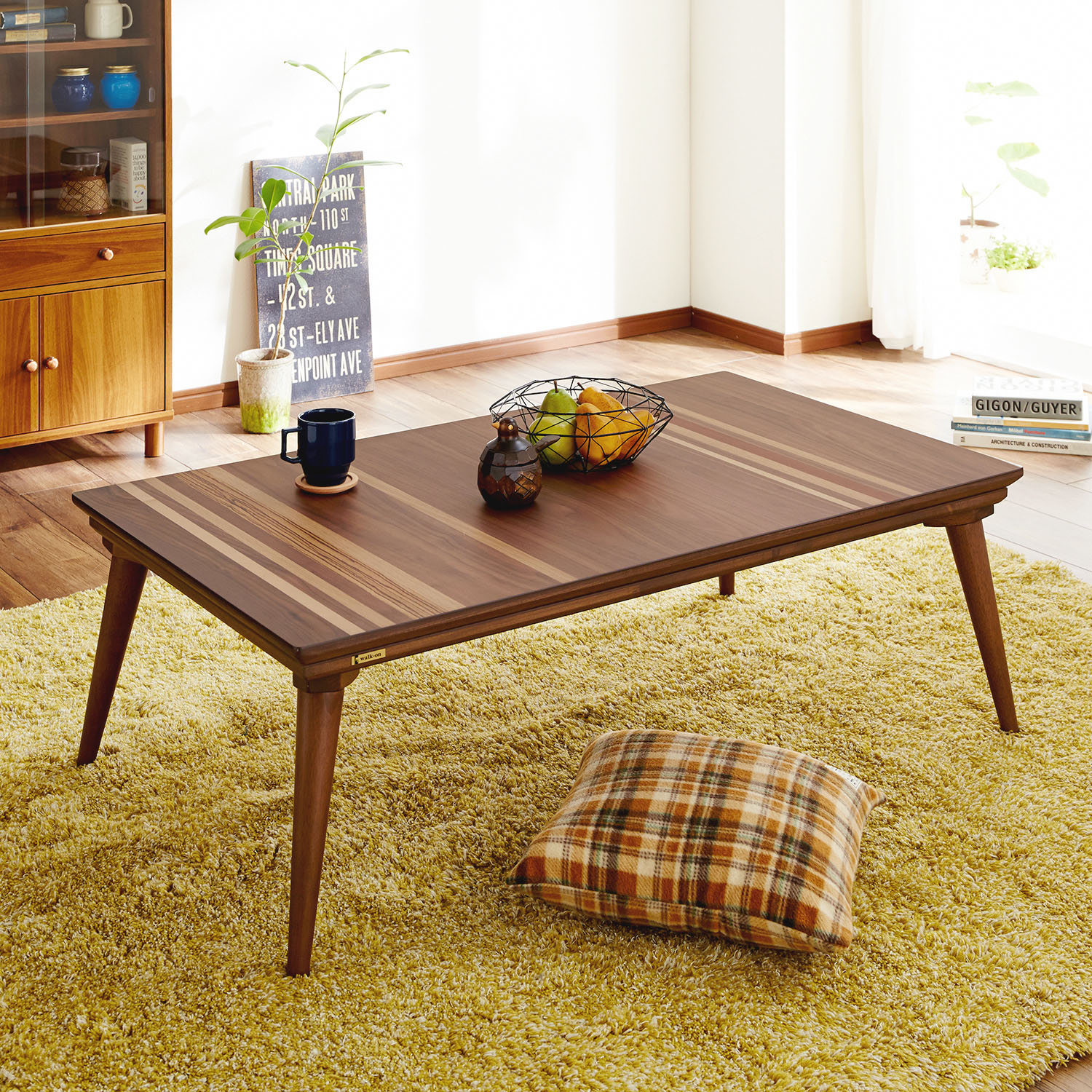 ウォルナット材の突板をベースに、メープル材やゼブラ材など複数の木材をランダムに並べた天板デザインが特長レトロさとカジュアルさをあわせ持った、ユニークな存在感が魅力。ヒーター部には即暖性の高いハロゲンヒーターを採用しています。オフシーズンにはコントローラーを天板裏にスッキリ収納OKスリムな先細りの丸脚がスタイリッシュな印象を与え、おしゃれなリビングテーブルとしても活躍します。)