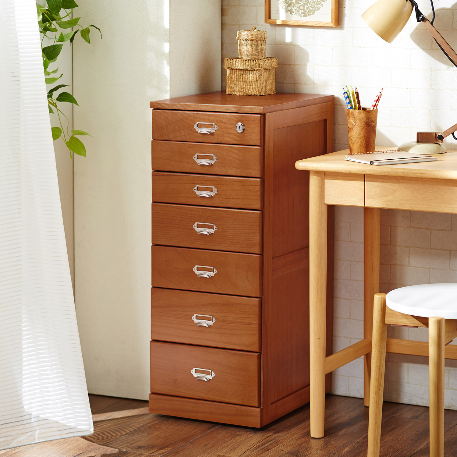 パイン材のオイル塗装で仕上げた味のある多段チェスト浅引出しと深引出しがあり、書類からボリュームのある小物まで整理できて便利分類に便利なネームプレート付きストッパー付きのキャスターを使用。移動もラクラク