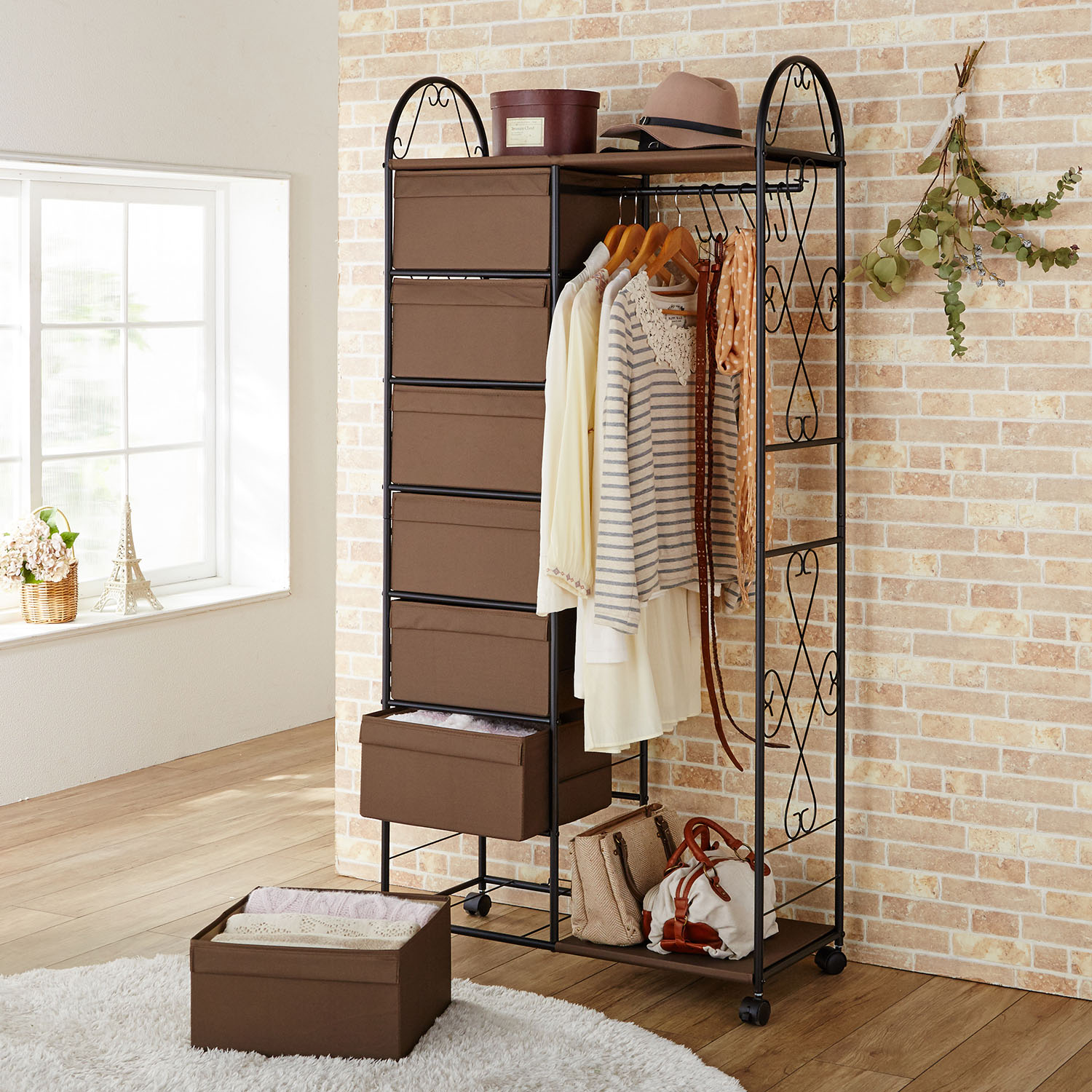 多段チェスト付きアイアンハンガーラック