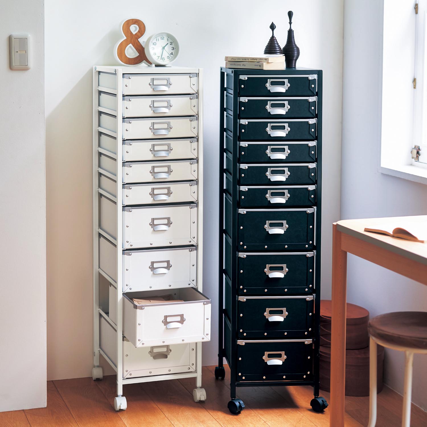 棚やデスクの上、カウンターの上などに置けるサイズ引出しにはA4の書類が入ります。天板には大理石調のメラミンシートを使用しておりナチュラルモダンな雰囲気インテリアのアクセントとしても映えます。「ホワイト」「ナチュラル」「ブラウン」の3色、2段~8段の展開で用途や収納量に合わせて