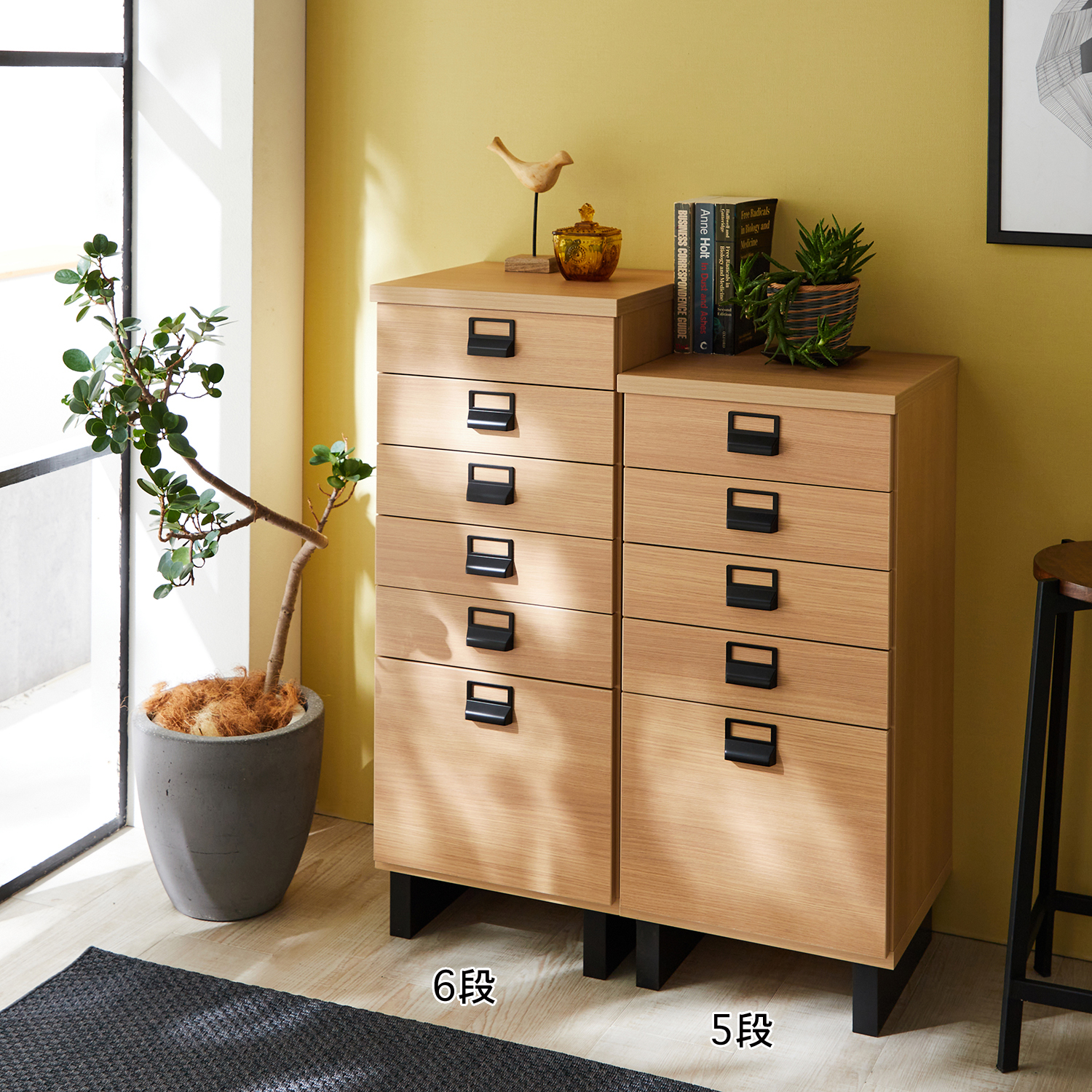メラミンシートを使用しており、お手入れしやすく光沢感のあるチェストホワイト・ナチュラル・ブラウン×ブラックのツートンでモダンなデザイン収納量に合わせて「5段」「6段」「7段」「8段」から選べます。書類や小物をしまうアイテムとしてはもちろん、FAX台としてもお使いいただけます。脚付きで圧迫感を抑えます。引出しはA4用紙が収まるサイズ感
