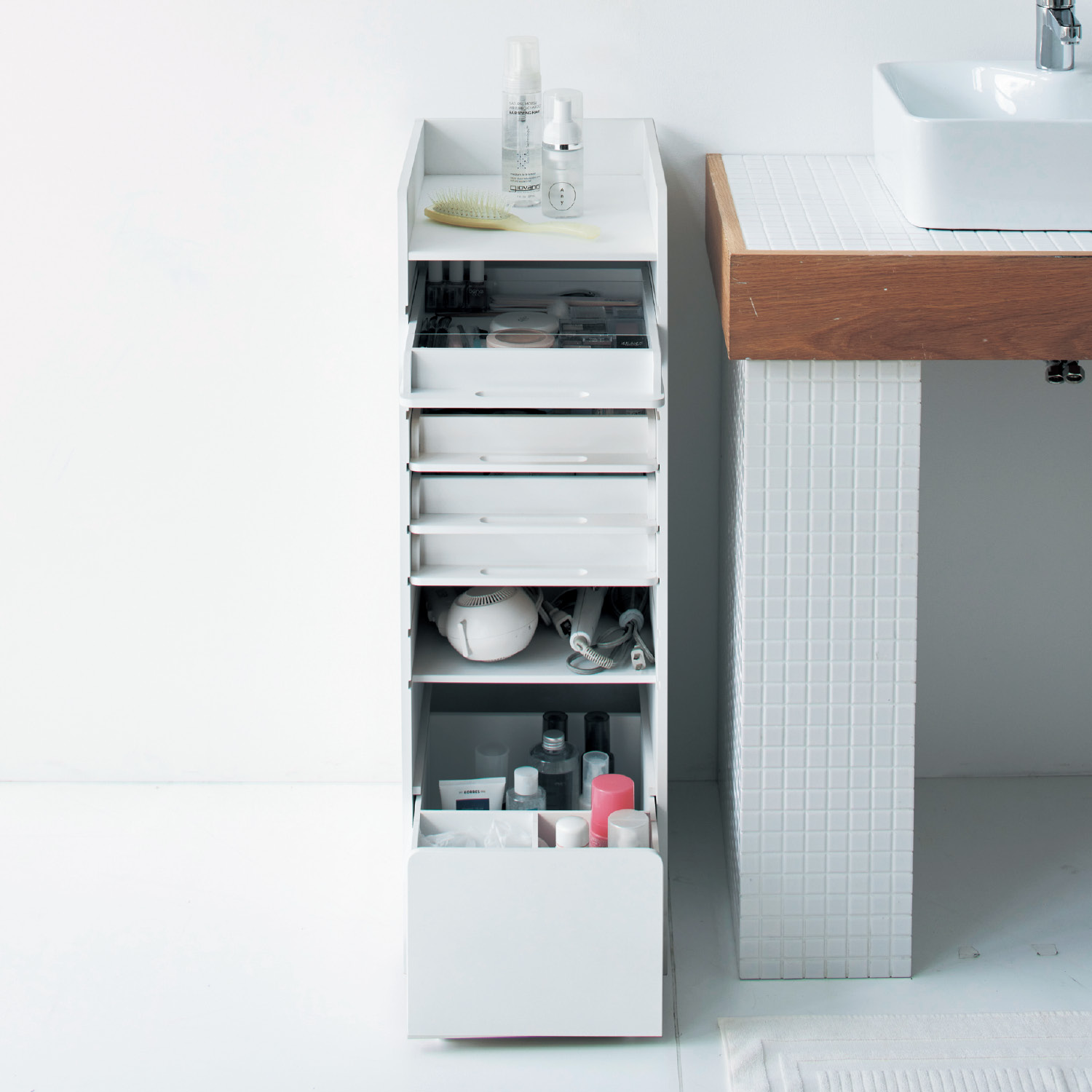 ーデザインー・ひとまとめにできないものを種類別に分別収納することですっきり!ー機能ー・浅引出し4杯と最下段の深引出しの組み合わせで、小物からボトル類までわかりやすく収納できる・浅引出しは収納物の高さに合わせて位置を移動できます。・浅引出しは単体で持ち運べる・浅引出しはアクリルの仕切り板2枚付きで細々したものもしまいやすい・最下段の引出しは手前にゴミ袋が2つかけられる・天板上にもモノが置ける・ランドリーやリビングなど、どこに置いても