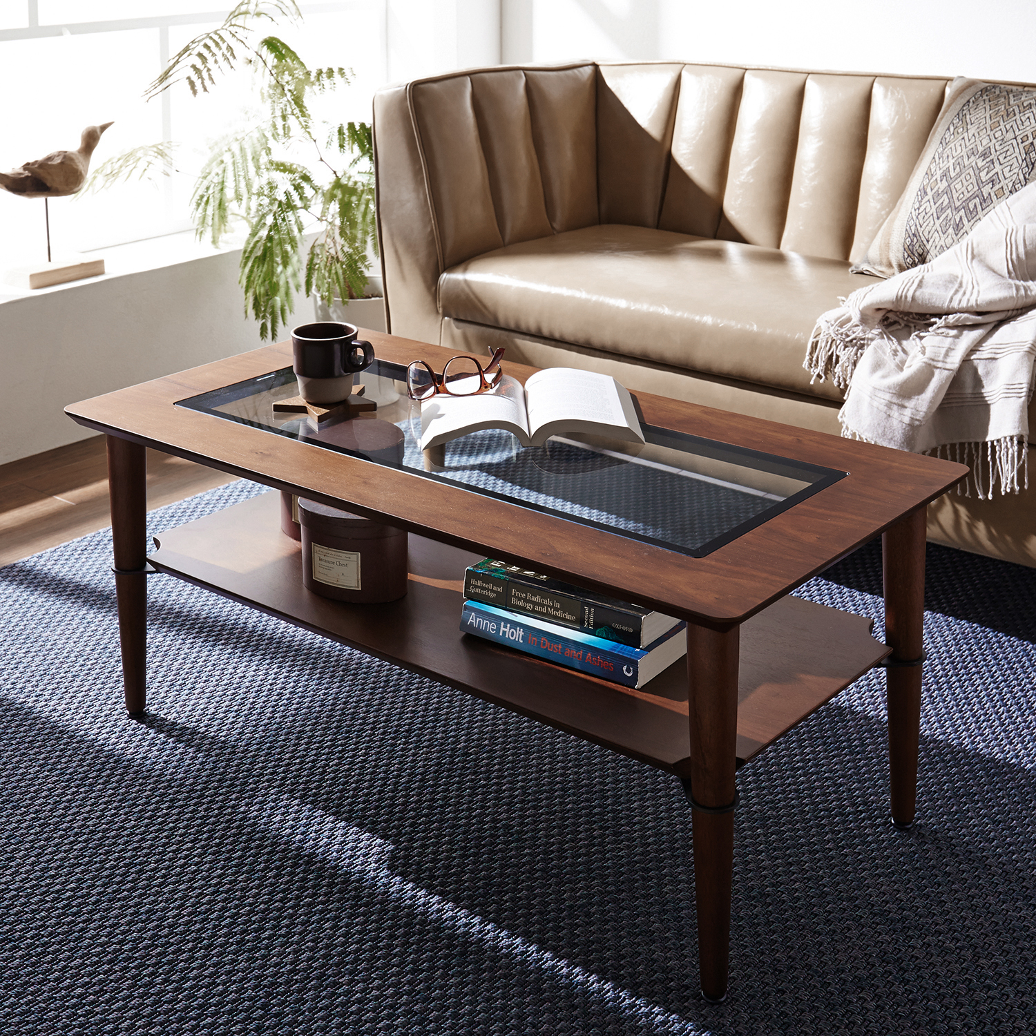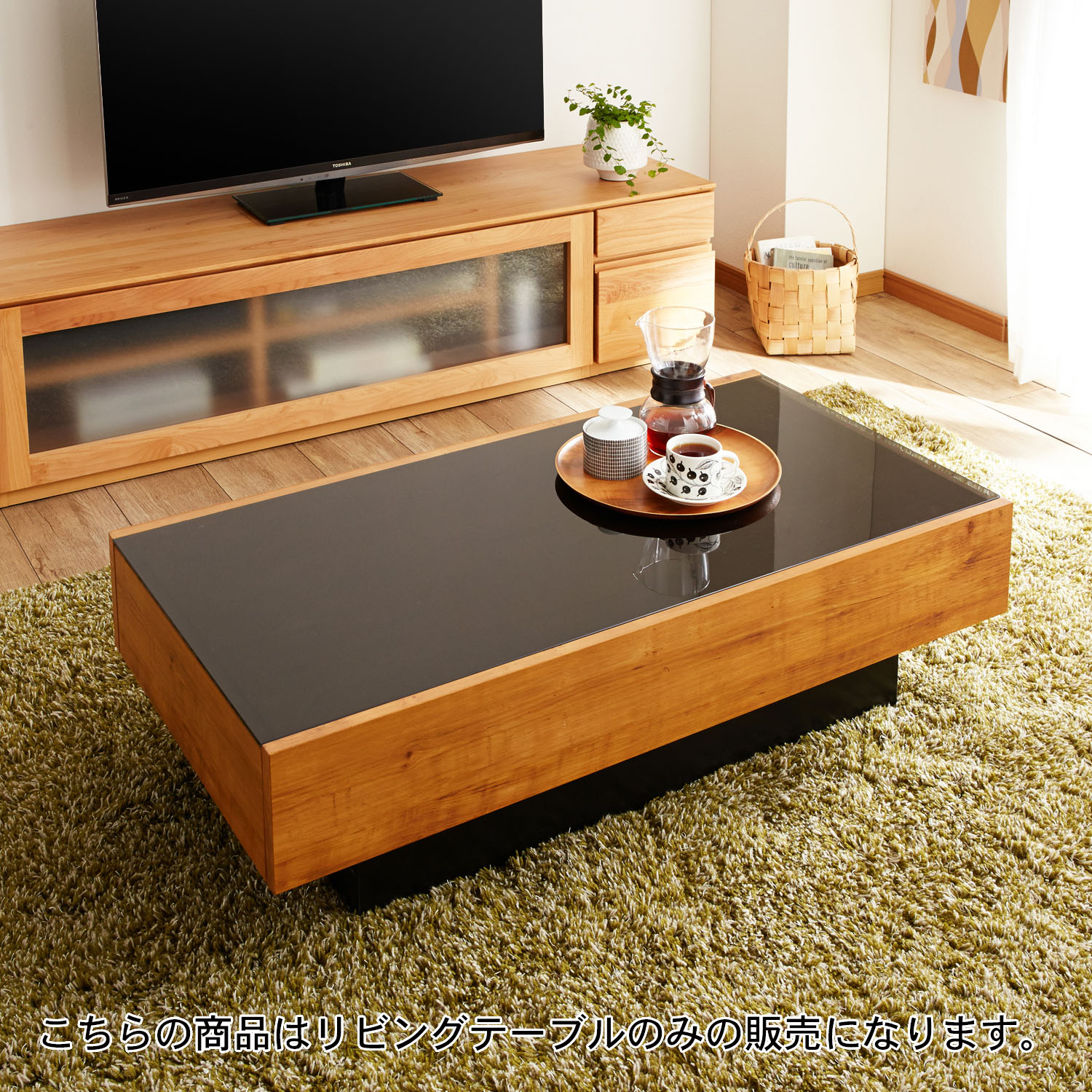 モダンなブラックガラスと落ち着いた木目のウォルナット材のローテーブル天板にはめ込んだ透け感のあるブラックガラスとの異素材使いがGOOD棚板付きでリビングまわりの小物スッキリ収納できます。)