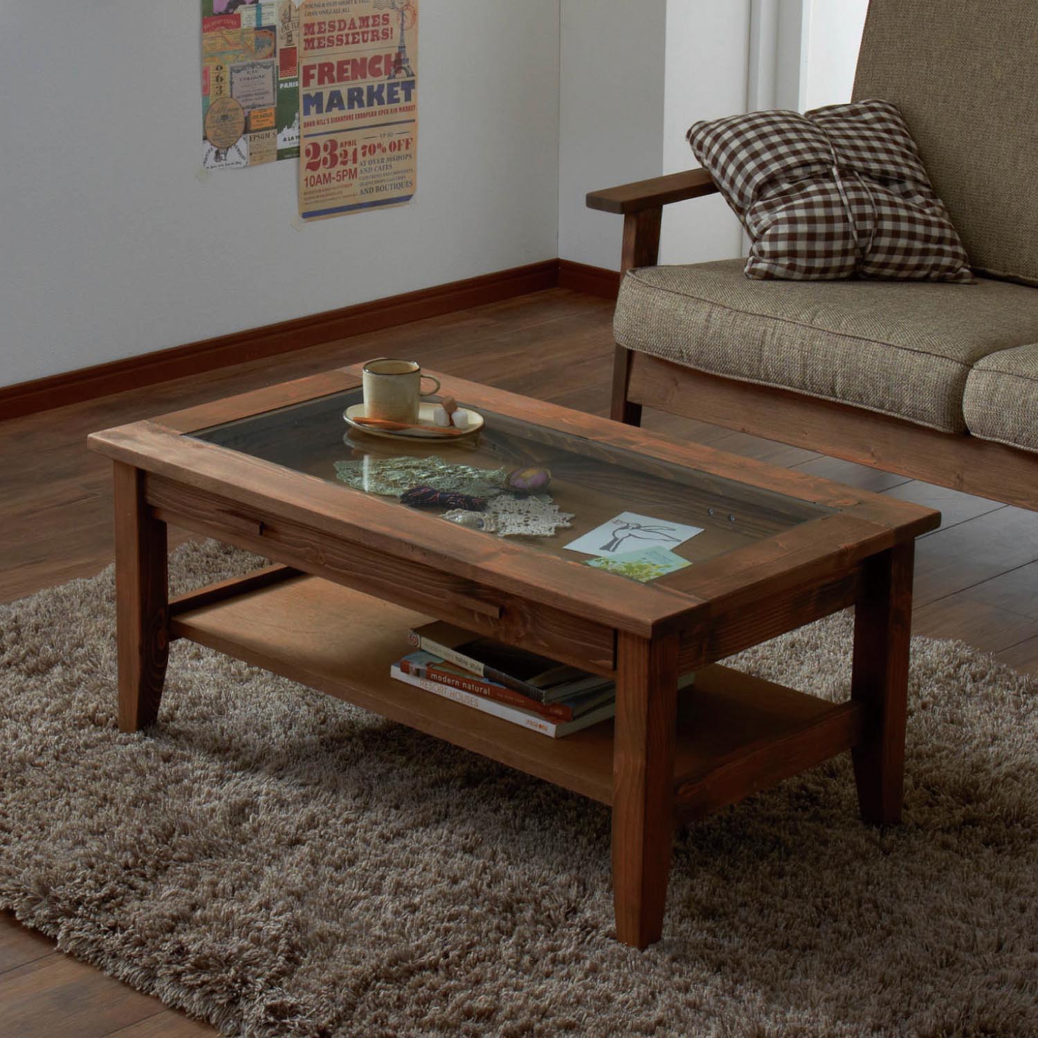 ヴィンテージ家具風の素材を使った、落ち着いた雰囲気のテーブル天板の中央に透明なガラスがはめ込んであり、引出しの中にお気に入りのコレクションを並べれば、おしゃれなディスプレイに早変わり引出しの中身を変えれば、お部屋の気軽な模様替えにも活躍してくれます。しかも引き出しは両方に取っ手がついていて、どちら側からも引き出せるので便利)