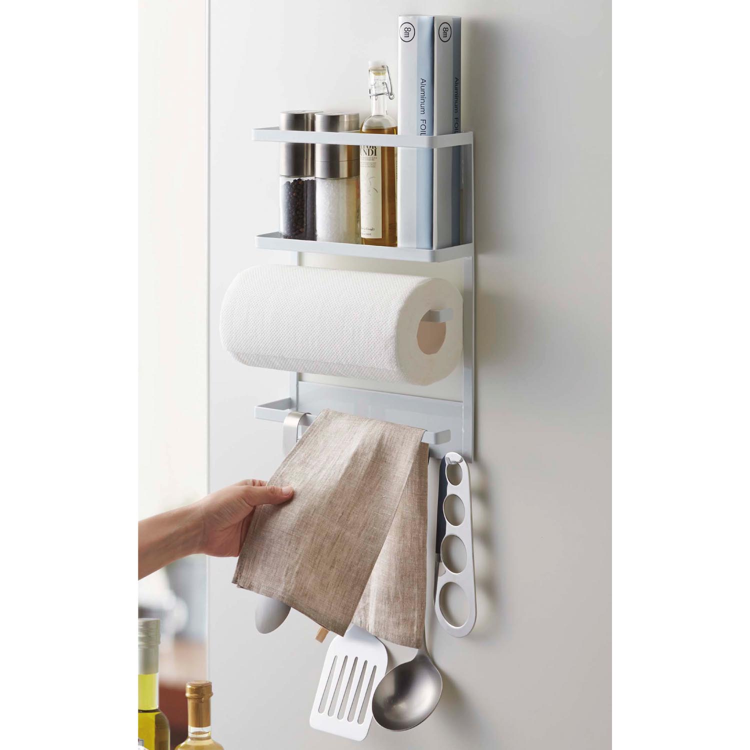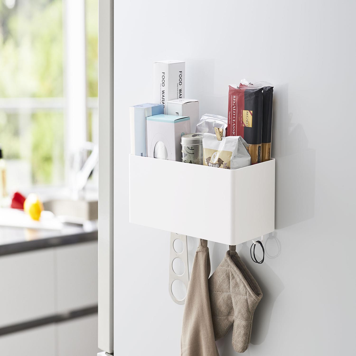 冷蔵庫側面に磁石でピタッと取り付けよく使う小物をまとめて冷蔵庫横に収納しましょうキッチンの家事導線を改善してくれます。上段にはラップやホイルを中段にはキッチンペーパーやふきん下段の6つのフックには鍋つかみや栓抜きなどをレシピ本やスパイスなどの置き場所にもぴったりマグネットで取付けできます。