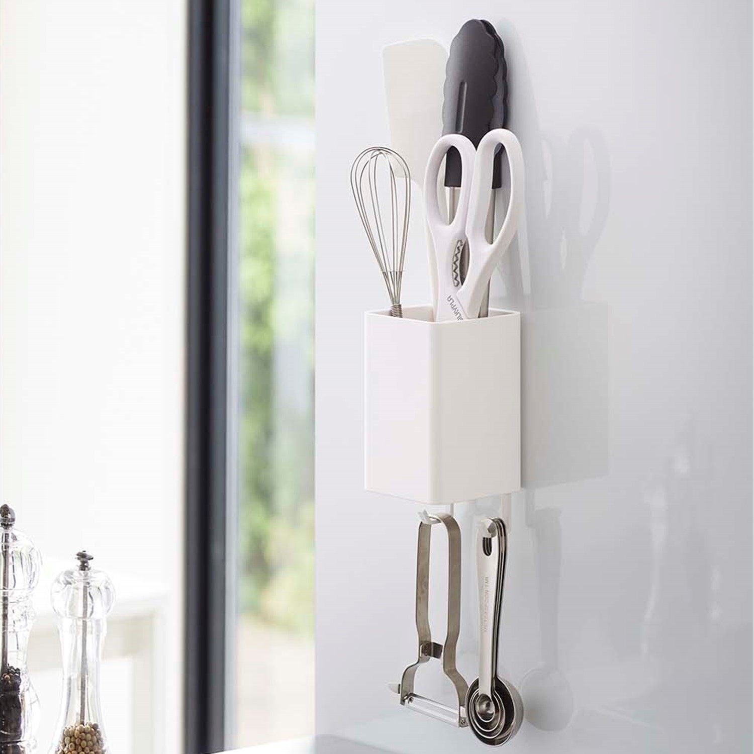 さまざまなシーンで活躍する、マグネットタイプの小物ラックスリムなデザインに仕切りが付いていて、筆記具などこまごましたものも分類して収納できます。仕切りは取り外し可能下部にはフック2個付きで、掛ける収納もできます。冷蔵庫横でキッチンツールの収納にバスルームで歯ブラシなどの収納に洗濯機に設置して、ドライヤーを収納してもマグネットで取付けできます。