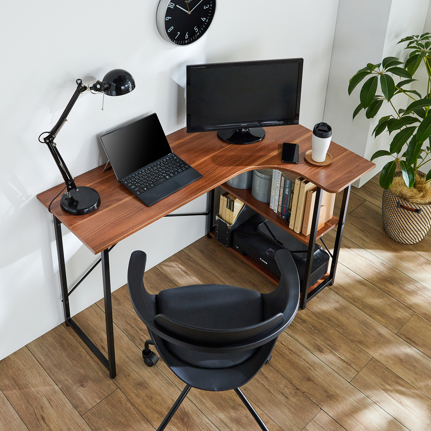 幅広いインテリアに馴染む木目調天板のL字パソコンデスク