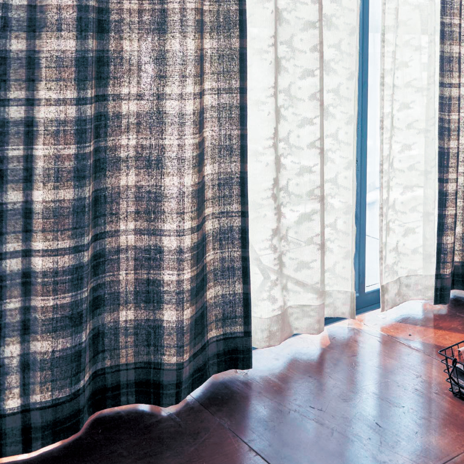 ネップの交じった綿混素朴な風合いと、先染めジャカード織りの繊細な色使いが大人っぽいカーテンざっくりとしたあたたかみのある落ちついた質感で、糸や風合いにこだわった先染めチェック無地の部分にもネップの風合いがあり、レトロ感があっておしゃれ日本の織物の産地で生地を織って縫製部屋の雰囲気が優しくなる光の透け具合こちらのカーテンは光を通す「非遮光」のもの