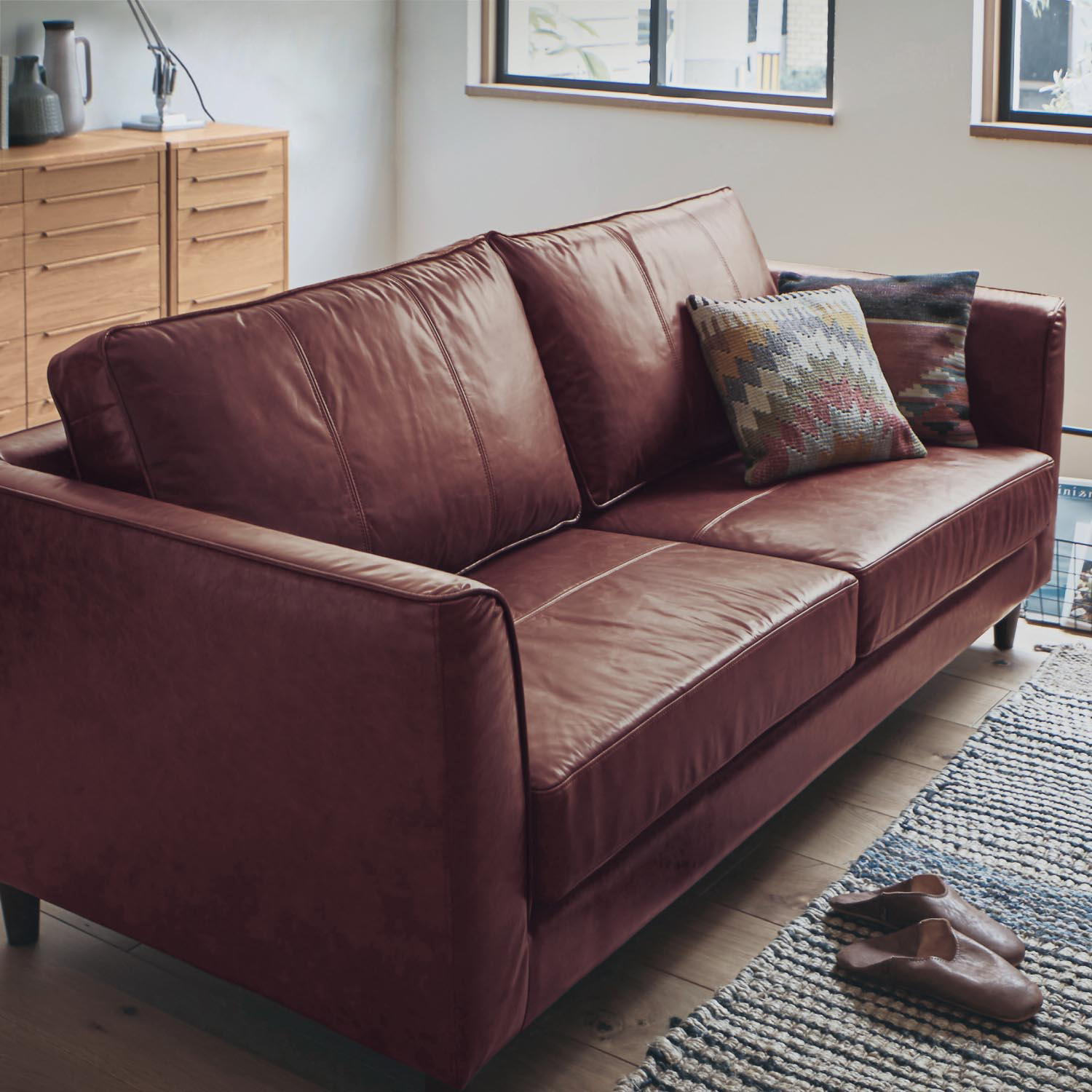 ビンテージ風のムラとなめらかな風合いが持ち味になる、オイルでなめしたアメリカ産レザーを使用さらに天然の風合いを残しながら耐久性をアップするための仕上げにもこだわった本格志向のレザーソファーです長く座っても疲れにくく、弾力のある座り心地のポケットコイル入りクッションは、奥行が深めなのでゆったりと身体をあずけ、楽なスタイルでくつろげます背面クッションは、型崩れしにくよう中央にウレタンフォームを使用表面はやわらかく、中はしっかり縁にステッチやパイピングで遊び心もプラス肌のあたらない外側にフェイクレザーを使い、手の届くレザーソファーをめざしました【素材、なめし、仕上げにこだわり】上質のアメリカ産レザーを使用。革をなめす際にオイルを含ませることで、肌ざわりのよさや独特のムラに加え、使い込むほどしっくりなじむ革本来の風合いが楽しめるように。さらに革に染料を染みこませたあと表面に顔料を薄くかけるセミアニリン仕上げにより、やわらかな質感を残したままお手入れのしやすさと耐久性を高めました。)