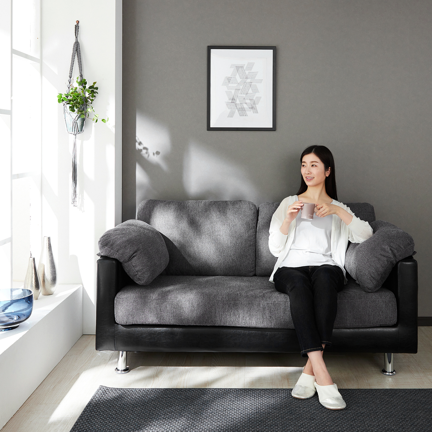 柔らかなファブリック、シックなビニールレザー、スチールの脚部が絶妙にマッチした2人掛けソファーふんわりとしたボリュームのあるクッションで、座り心地抜群アームクッションはファスナーで本体に固定できる仕様で、どんな体勢でくつろいでもクッションがずれません脚部を取り外すとロータイプとしてもご使用いただけます)