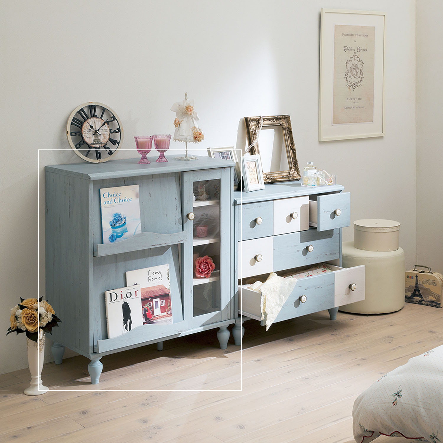 使い込まれたような風合いと大人っぽい愛らしさが魅力のフレンチシャビー風シリーズのフラップガラスキャビネットブルーとホワイトのツートンカラーや使い古したような取っ手、ろくろ足などディテールにもこだわり満載羽目板風の背板デザインもお見逃しなくお気に入りの雑誌や洋書をディスプレイできるフラップ扉式の収納と可動棚が3枚付いたガラス扉のキャビネットの組み合わせ見せると隠すを上手に使い分けることができて重宝すること間違いなし!お客様組み立てか完成品お届けのどちらかをお選びくださいこの商品は完成品でお届けすることもできます。完成品をご希望の方は「お届け時の状態」で「完成品でお届け」をお選びください※価格が異なります。のでご注意ください