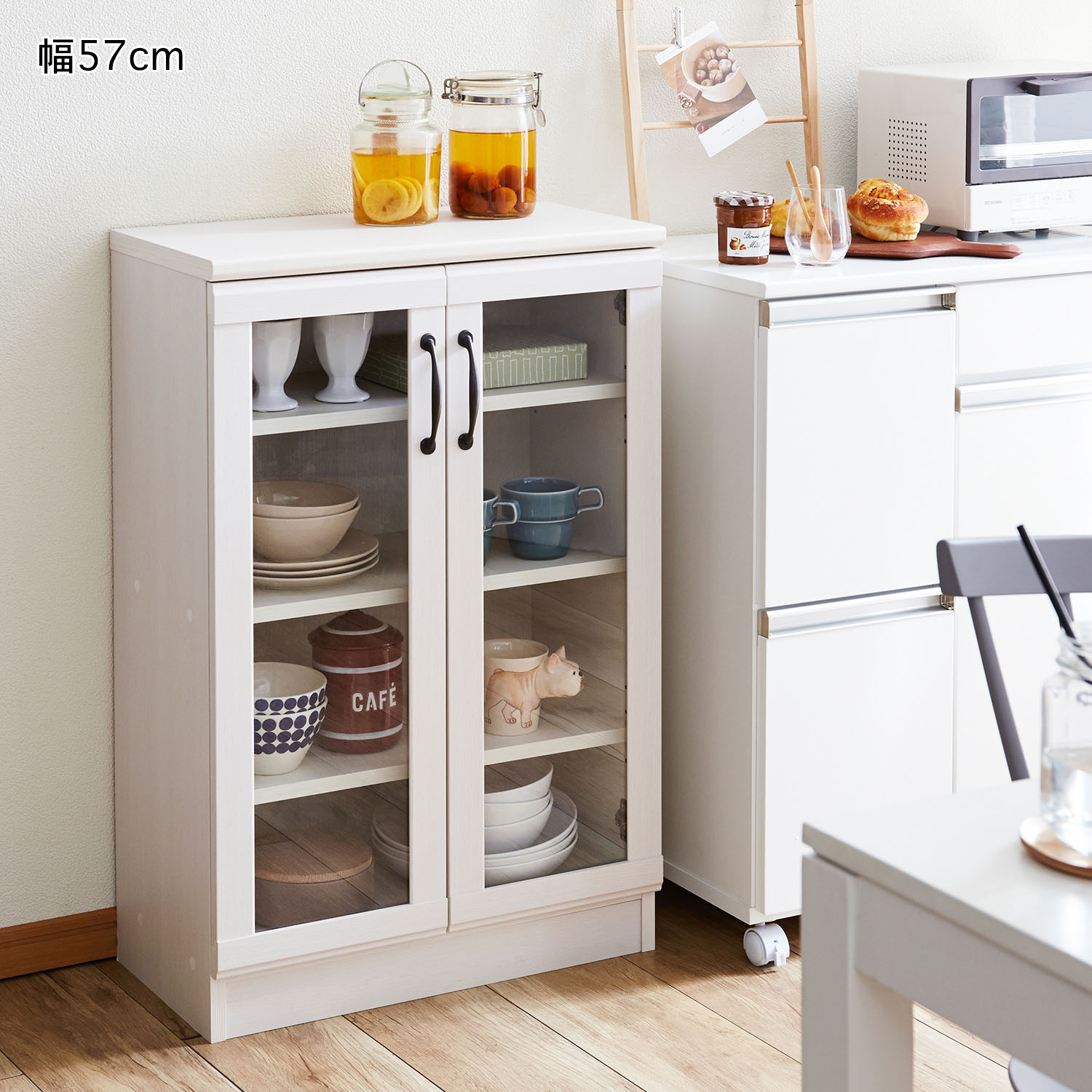 リビングで飾り棚として、またキッチンでカップボードとしてなど、幅広く活躍するガラスキャビネット。両開き戸の中央が固定棚、その他の棚板はそれぞれ高さを4段階に変えられるので、本や雑貨、高さのあるグラスなどしまうものに合わせて調節して本体には爽やかな印象を与えるホワイトカラーの木目調シートを採用ブラックスチールの取っ手が全体を引き締めるアクセントになっています