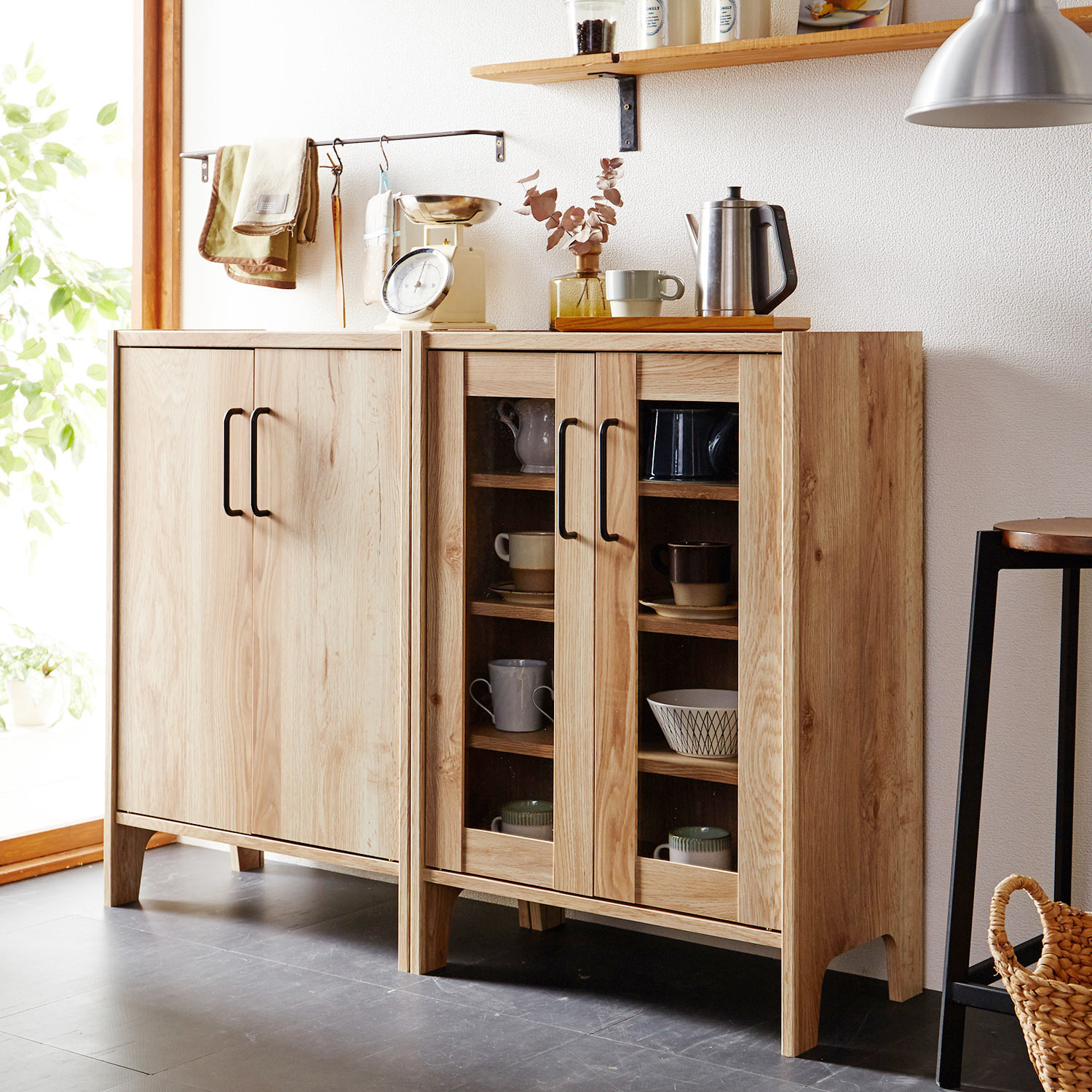 リビングで飾り棚として、またキッチンでカップボードとしてなど、幅広く活躍するガラスキャビネット。両開き戸の中央が固定棚、その他の棚板はそれぞれ高さを4段階に変えられるので、本や雑貨、高さのあるグラスなどしまうものに合わせて調節して荒々しい木目を表現したナチュラル感たっぷりのシートを採用ノコ目で傷をつけたようなあしらいがビンテージ感をプラスし、シルバーカラーの取っ手がスタイリッシュな印象にまとめています。こちらの商品は、届いてすぐ使える「完成品」と、ご自身で組み立てる「組み立て」から