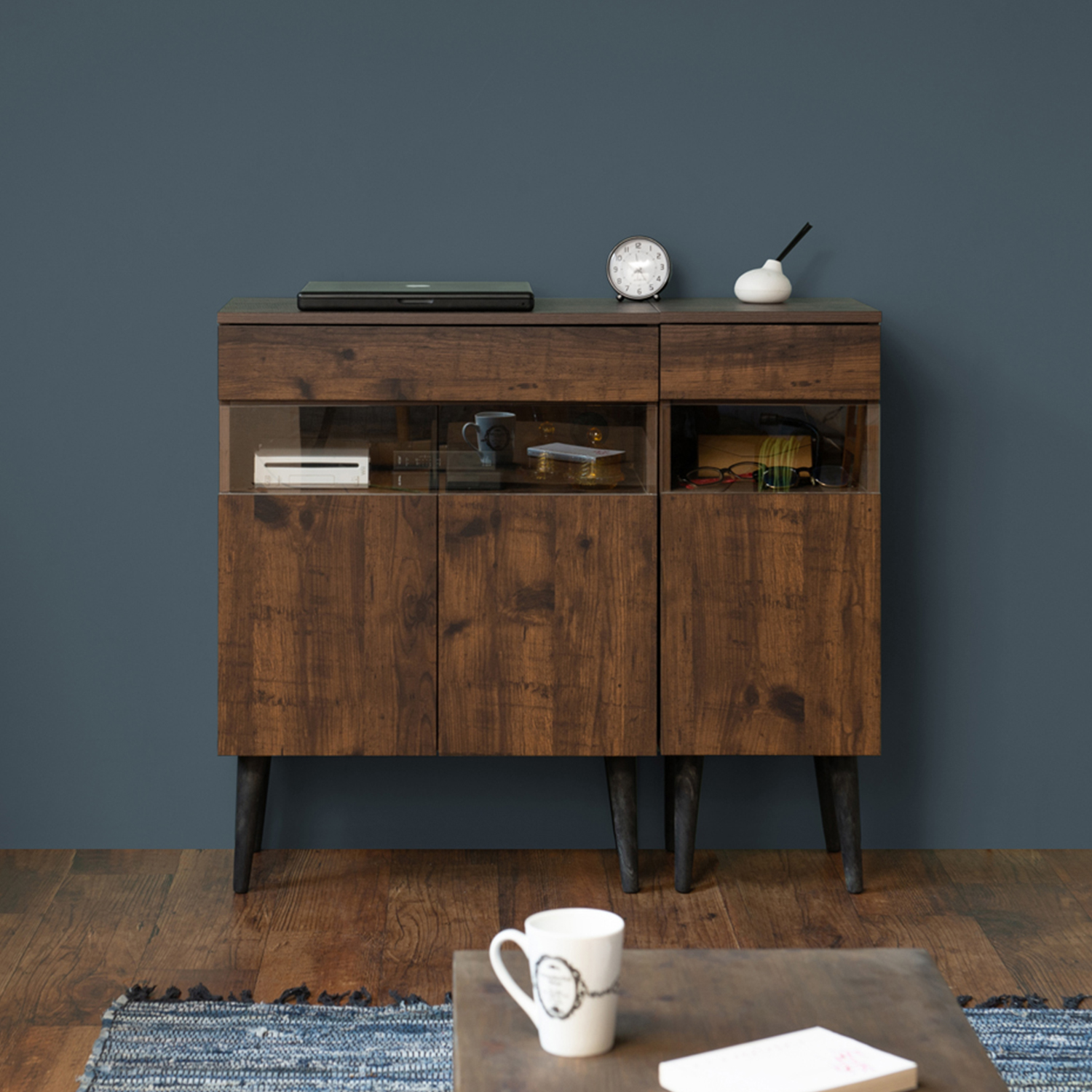 ヴィンテージ感漂う味のある木目柄のシートを使用長さ20cmのすっきり細い脚部が印象的なデザイン上部の引出しには細かい物の収納にガラス部分には雑貨などをディスプレイして好みの雰囲気にアレンジ板扉内にははごちゃつきがちな配線や野暮ったいルーター機器などを隠して収納可能配線にもこだわっているので、ファックス台としての使用もおすすめ。