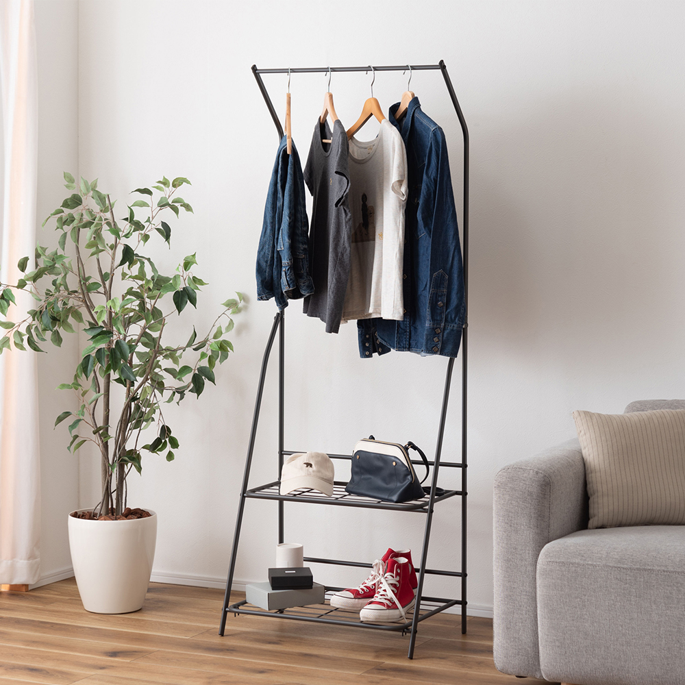 省スペースデザインで場所を取らず、スッキリ置ける折りたたみ式ハンガーハンガーの傾斜を2段階で変える事が出来るので、高さ・奥行きの調整が可能下部にはバッグやボックスを置ける棚板付き使わない時は隙間収納しておけるのも嬉しいポイント折りたたみむとコンパクトになるので持ち運び楽々シンプルデザインのスチール製)