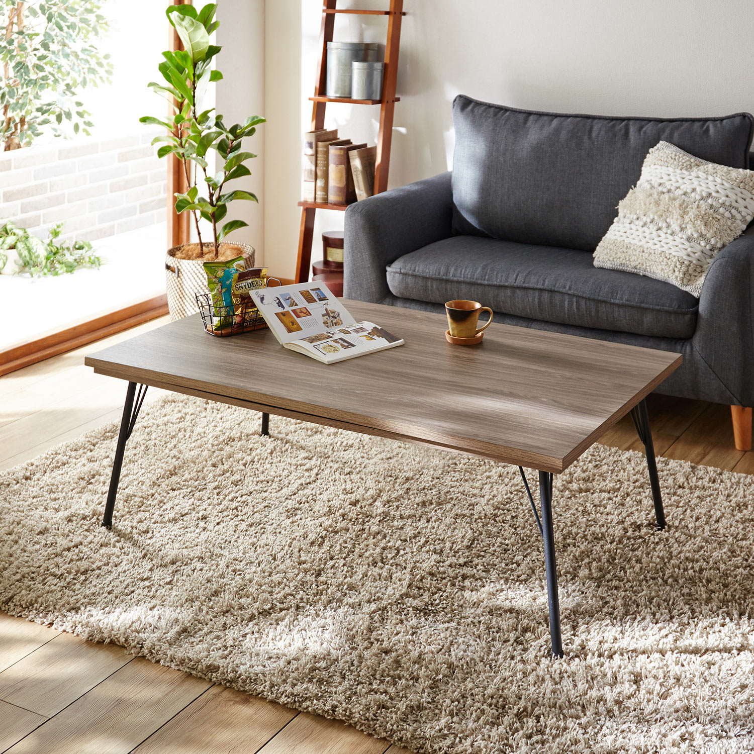 木目調シートでナチュラルに仕上げているから、男前や塩系、カフェ風など幅広いテイストのお部屋に好相性スタイリッシュな表情を見せる華奢なスチール脚もデザインポイント(このテーブル「こたつ」なんですよ)