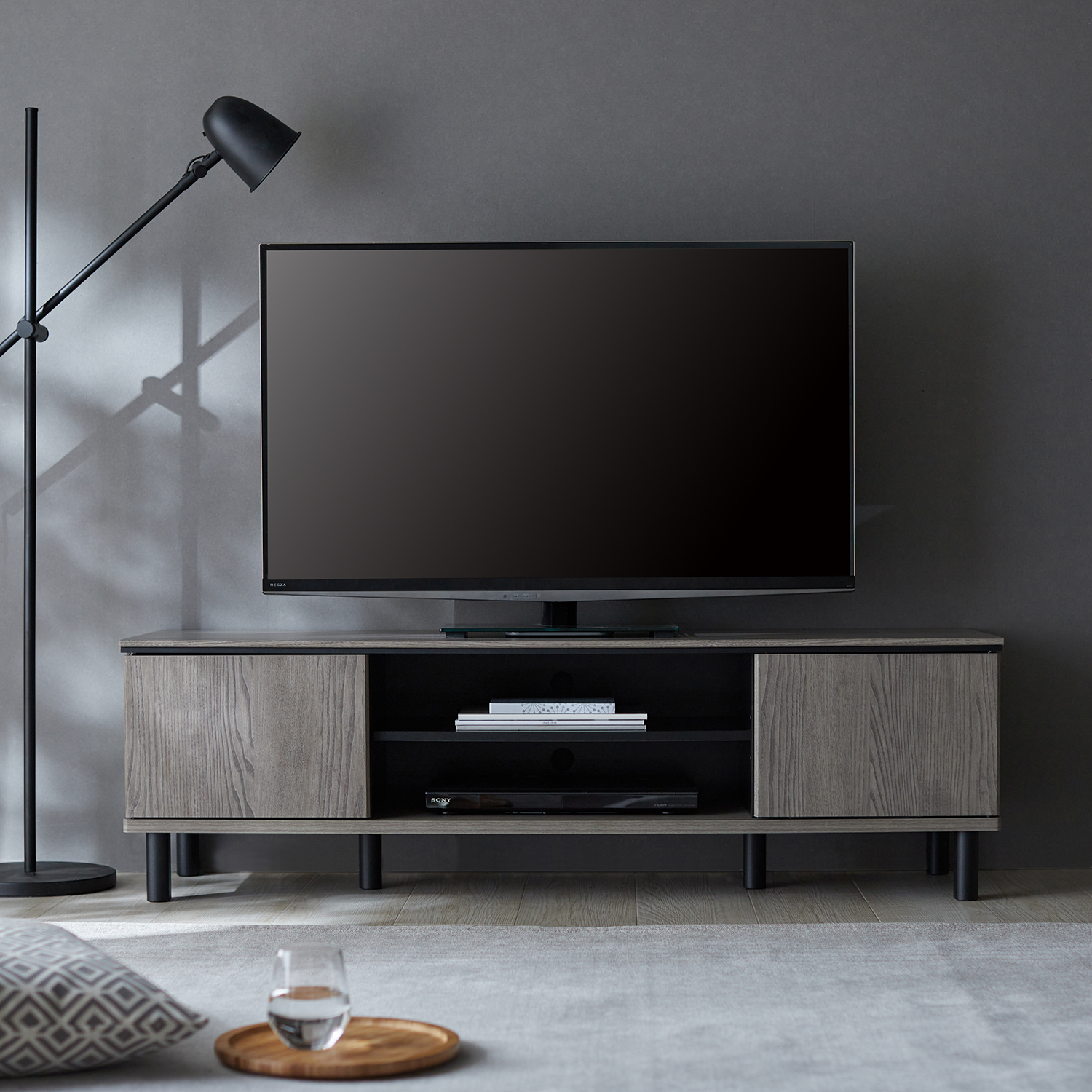 グレージュの木目とブラックのツートンカラーのシリーズ落ち着きがありながらも、木目の柔らかさを感じるデザインです背面には電源タップを収納できるスペースがあり、配線もすっきり収まります。2箇所の開き扉収納はプッシュオープン式。高さがあるので、ゲーム機やルーターの収納にも脚部は11cmの高さがあるので、自動掃除機も通ります)