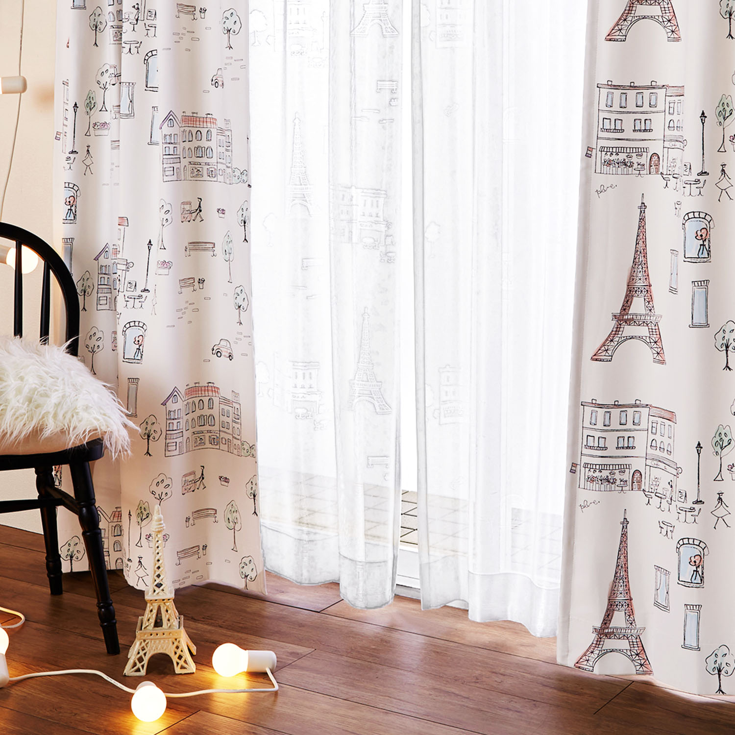パリの街並みをモチーフにしたデザイン性溢れるレースカーテン同柄の厚地カーテンと合わせるのはもちろん、白地なので幅広いデザインカーテンに合わせることができます。窓にぴったりのサイズが見つかるオーダータイプ)