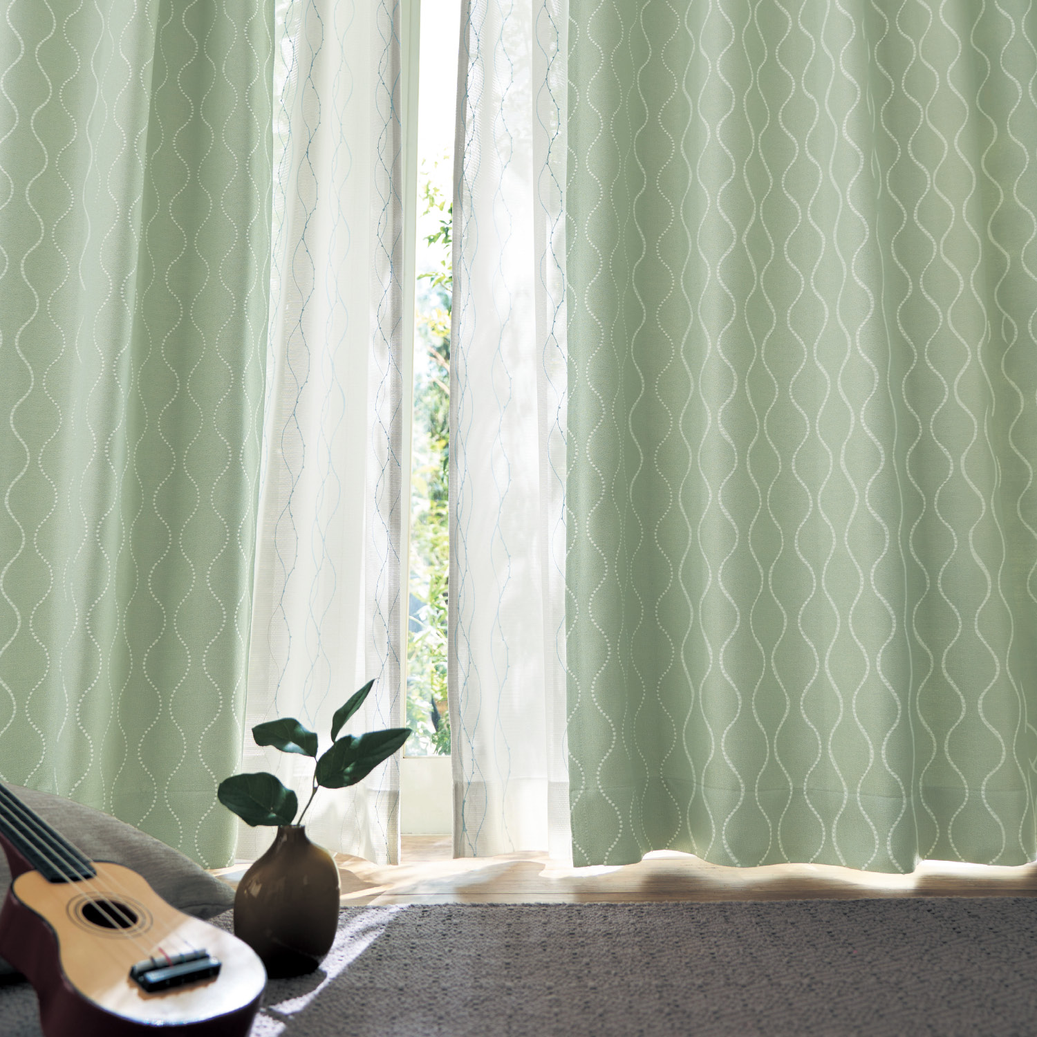 綿糸部分が染まらず白く残って、落ち着いた杢調に一年中快適に過ごせる遮光・遮熱機能付き主張しすぎず自然にお部屋になじむグリーンが印象的小さな花束がたくさん舞う、気分が晴れやかになるカーテン