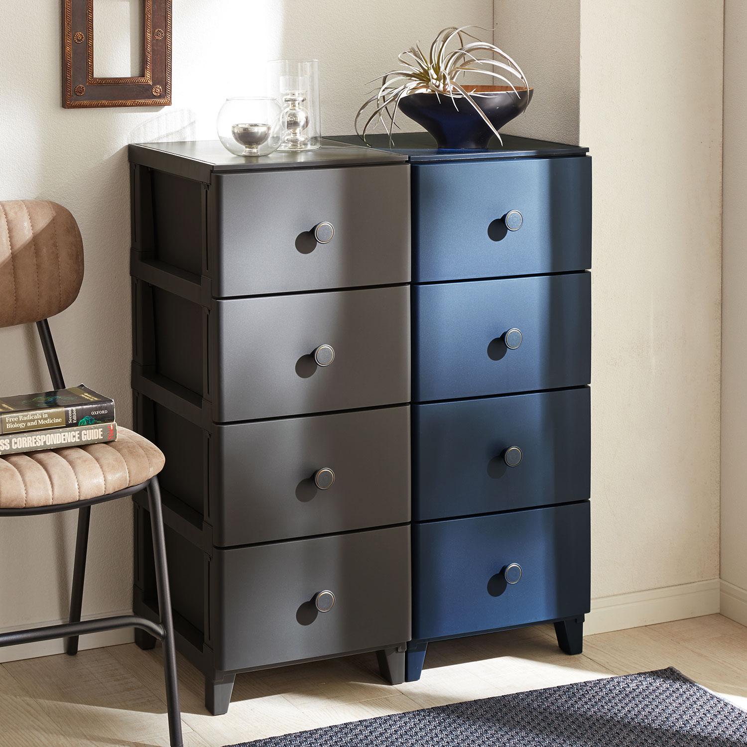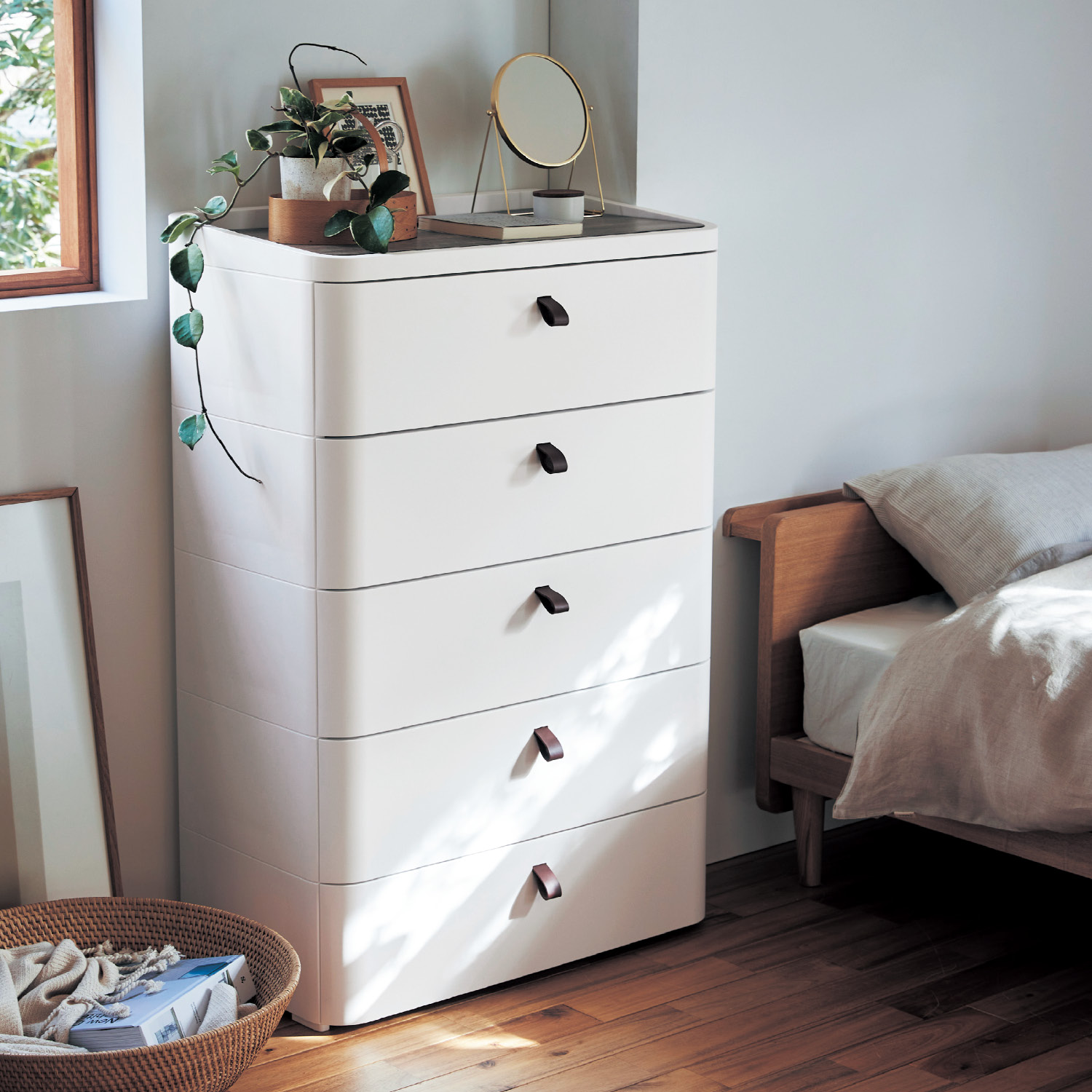 樹脂素材に見えない、おしゃれな見た目の収納チェスト木調天板や本革取っ手で落ち着いた印象と上質感をプラスしたデザイン天板は表情の違う木目調シートを使用したリバーシブル仕様木目調シートは塩化ビニル素材でお手入れ楽々引出し内に隠せる浅トレー付きで、こまごまとした小物も収納OKスムーズな開閉が心地良い スルッと開いてスキッと閉まる引出しキッチン、リビング、寝室、子ども部屋と幅広いシーンで活躍します。#引き出し収納#引出し収納#衣類収納