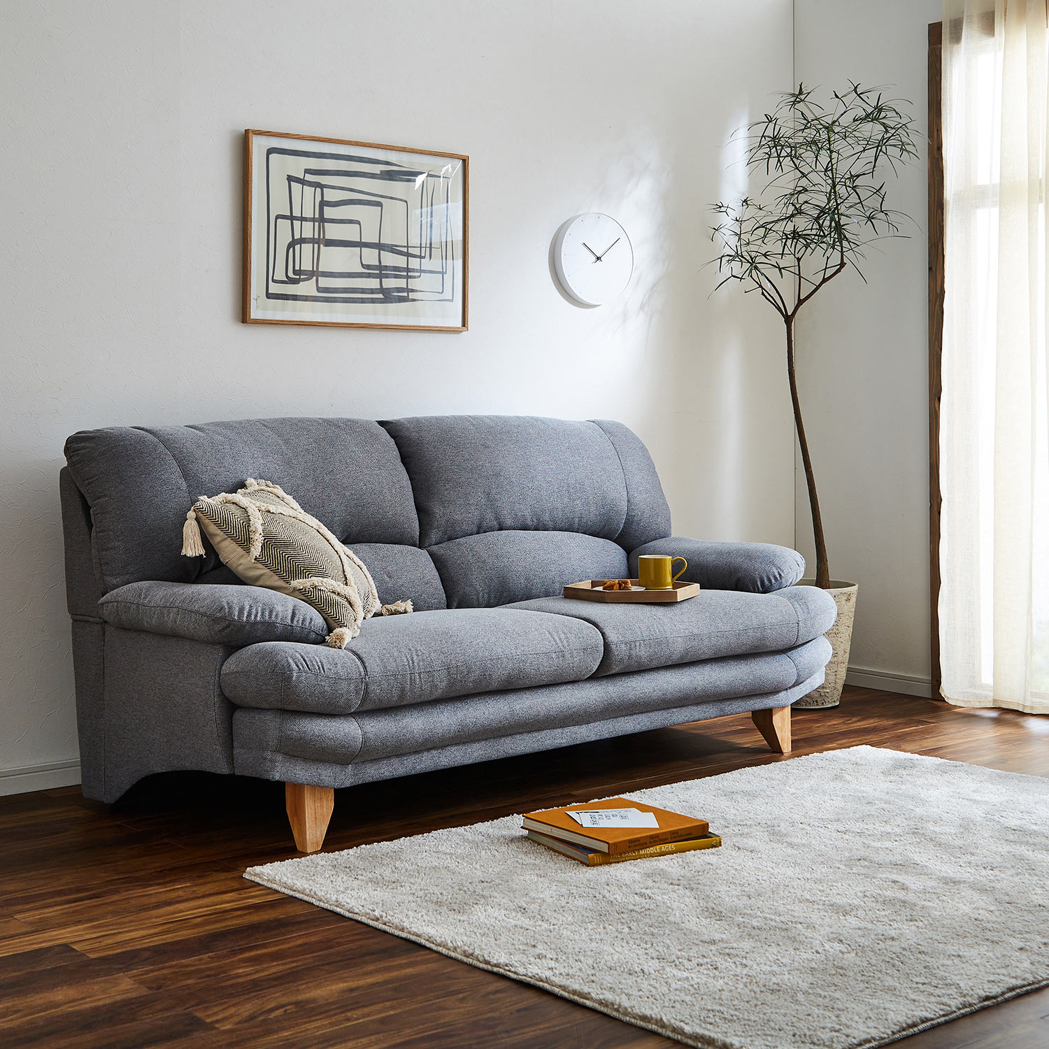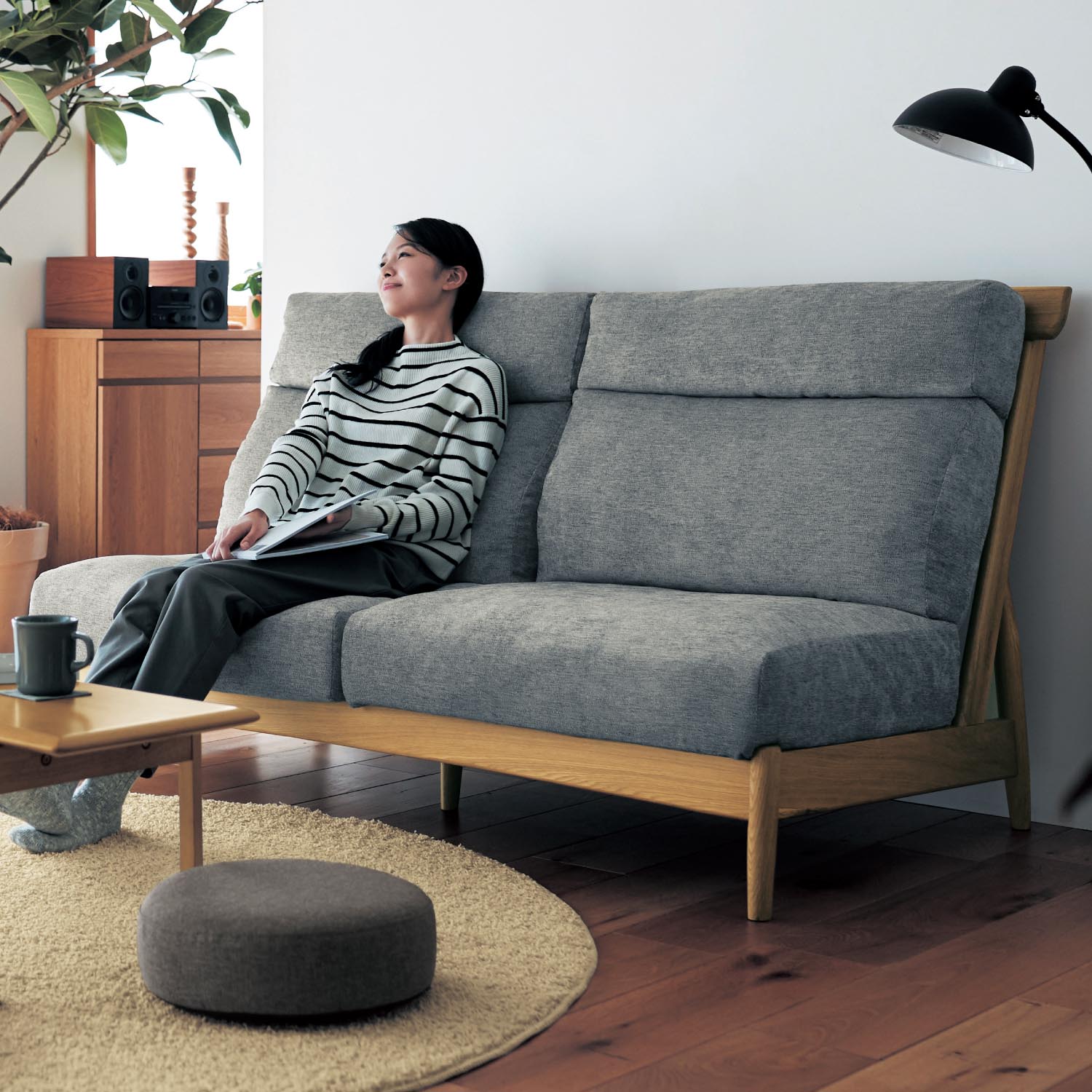 首元まで支えてくれるハイバックソファー長時間座っていても疲れにくい織り感のある生地と天然木のフレームを組み合わせた暖かみのあるデザイン木フレームはオーク材を贅沢に使用しており、部屋にすっきり馴染みます)