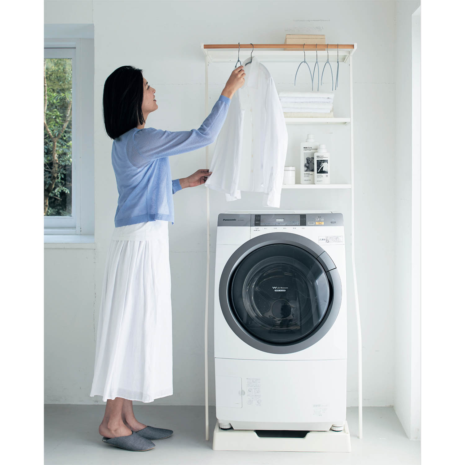 無機質になりがちな洗濯機周りのインテリアも、ナチュラルなアイテムと合わせて雰囲気を出す