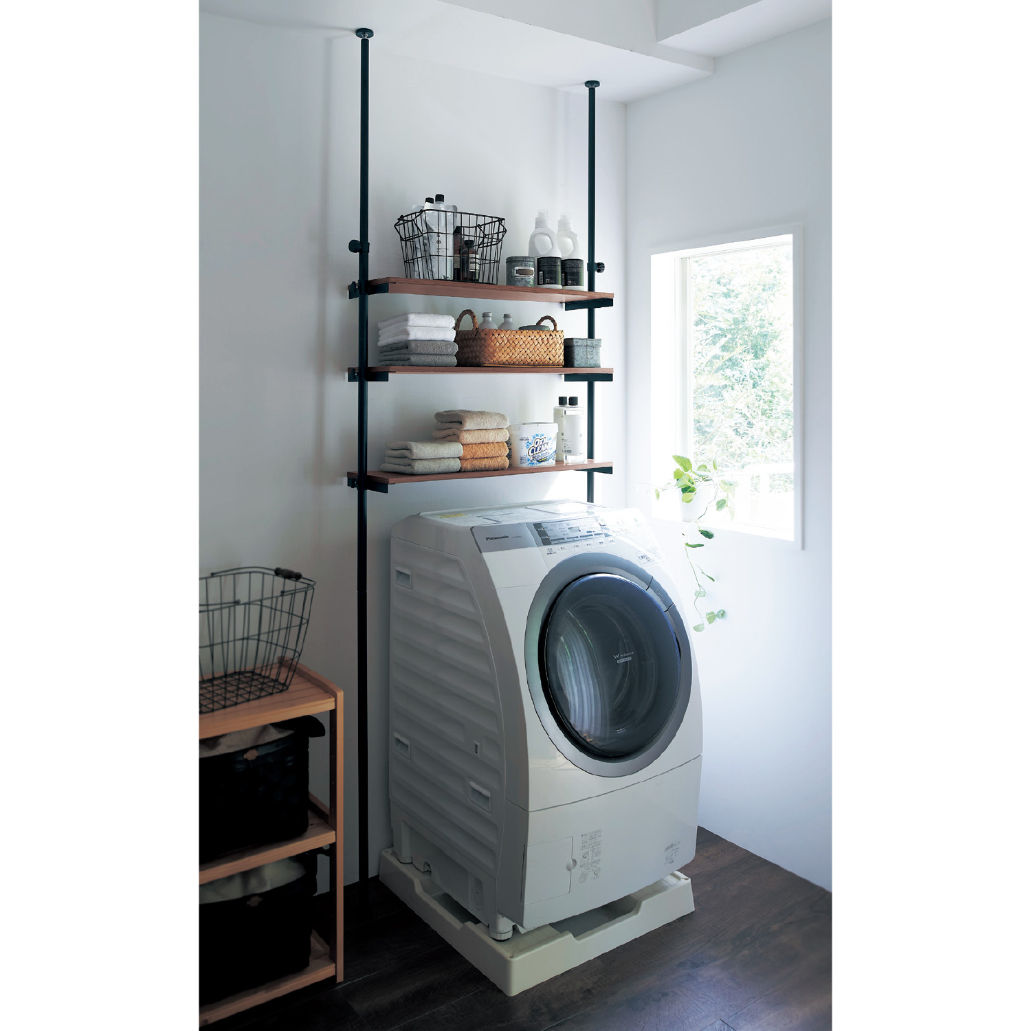 ランドリーラックは無機質なものが多いので、バスケットなどでナチュラル感を出すと簡単ですね