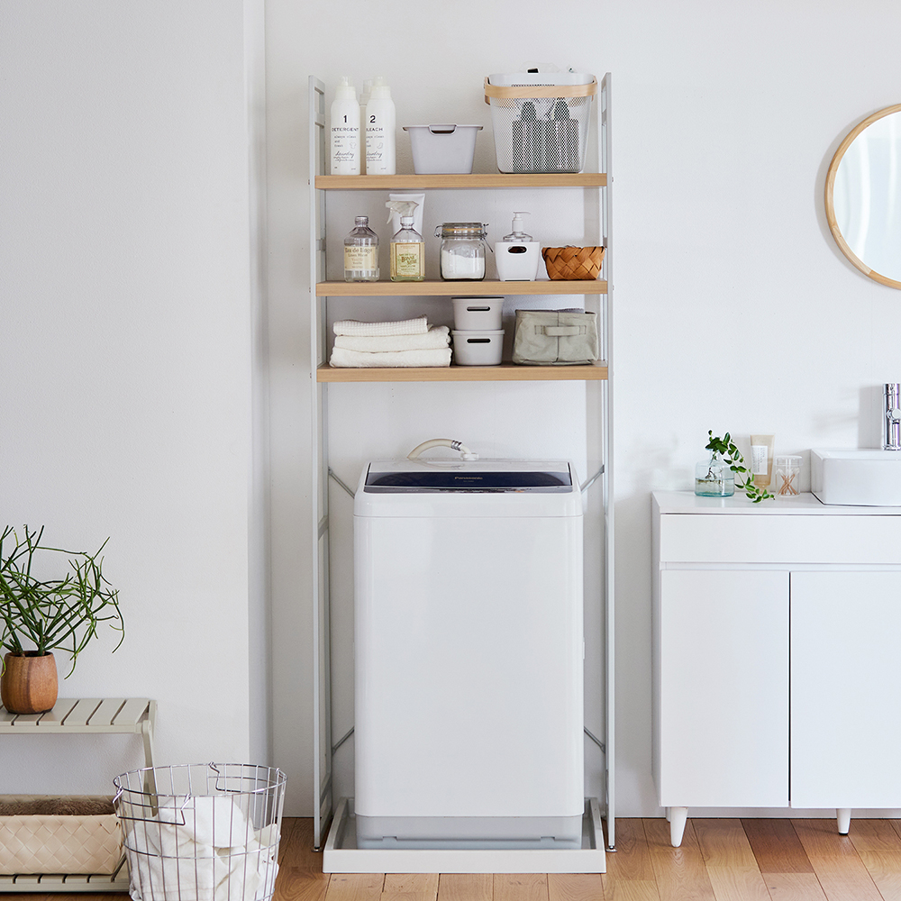 まろやかなグレー色のスチールフレーム厚みのある木目調棚板とのバランスが生活感を抑えた佇まい―仕様―棚板の高さを洗濯機に合わせて調節でき、スペースの無駄なく収納できます。フラットな棚板なので小物や洗剤などのボトル類も安定して置けます。厚さ30mmの可動棚板は安心の耐荷重量25kg