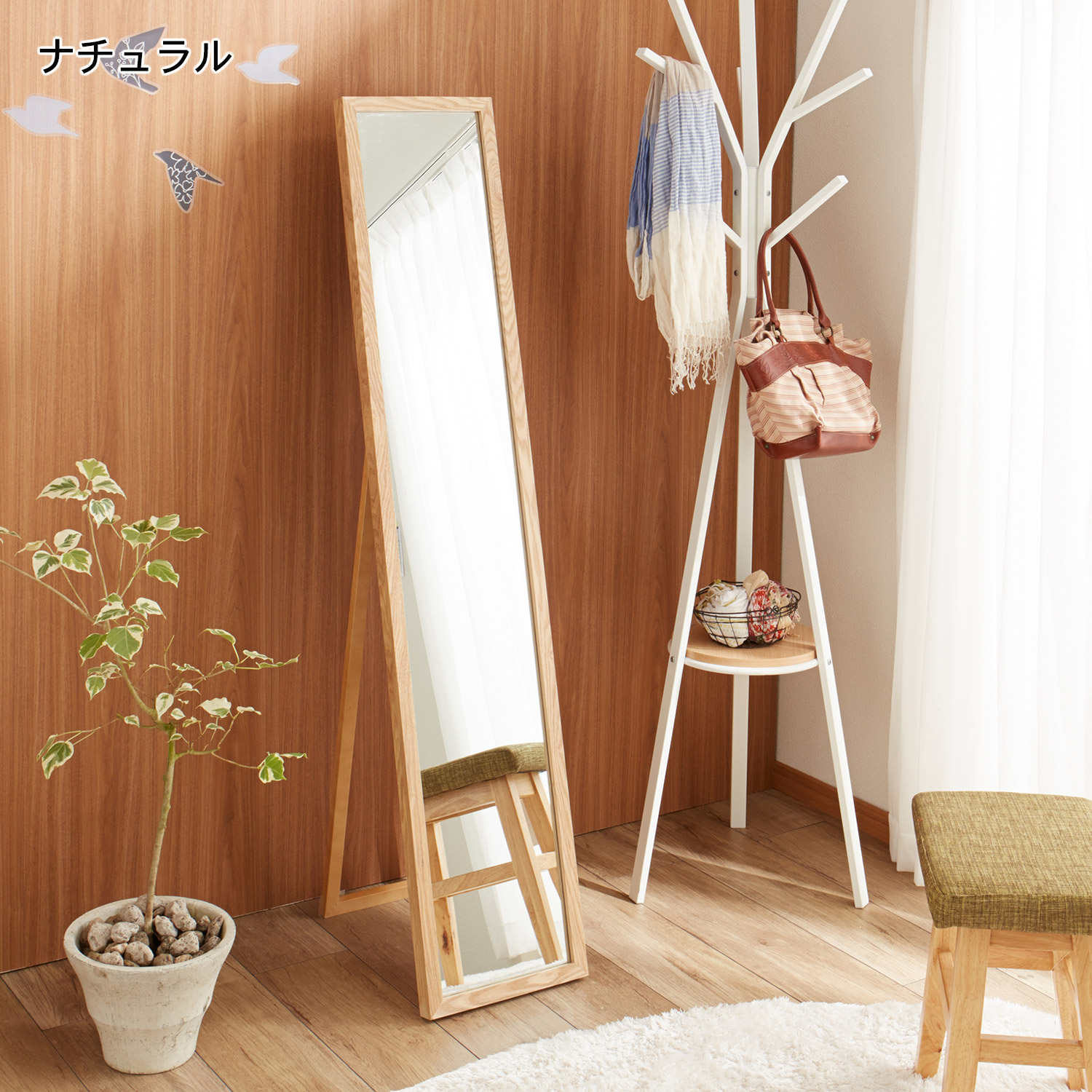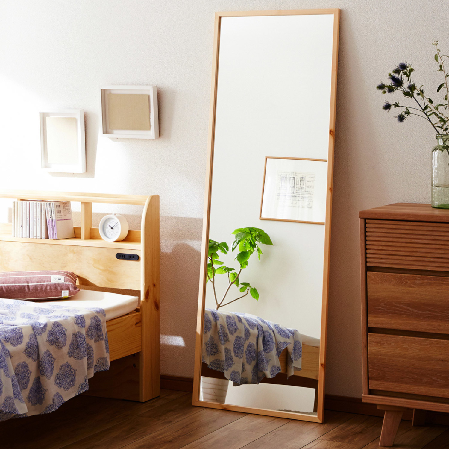 パイン材を使用した、素朴な風合いを楽しめるシンプルな立て掛けミラーところどころに見える節に、天然木ならではのやさしいぬくもりが伝わります。全身をしっかり映せるサイズながら、細身のフレームデザインで圧迫感を抑えているのが魅力お部屋を広く見せる視覚効果もあるので、リビングや寝室、狭い玄関などにもおすすめです幅サイズの異なる3タイプから、お好みで
