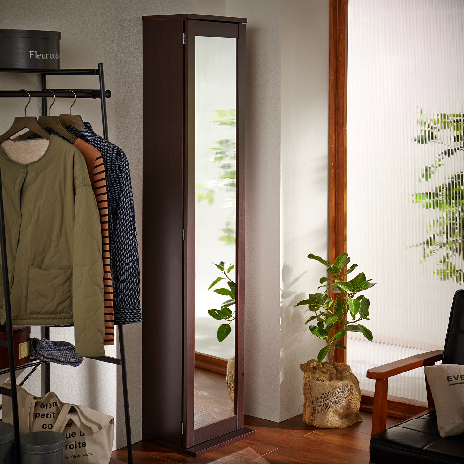 玄関の限られたスペースや一人暮らしのお部屋にも置ける、スリムなミラーキャビネット高さがあるので全身がしっかり映り、お出かけ前にコーディネートをチェックするのに活躍します。どんなテイストのお部屋にもしっくり馴染む、木目調のナチュラルなデザイン扉の中は固定棚2枚と可動棚が3枚付いており、本や小物をたっぷり収納可能下には倒れ止めが付いているのもポイントです#全身鏡#全身ミラー#姿見鏡#姿見ミラー