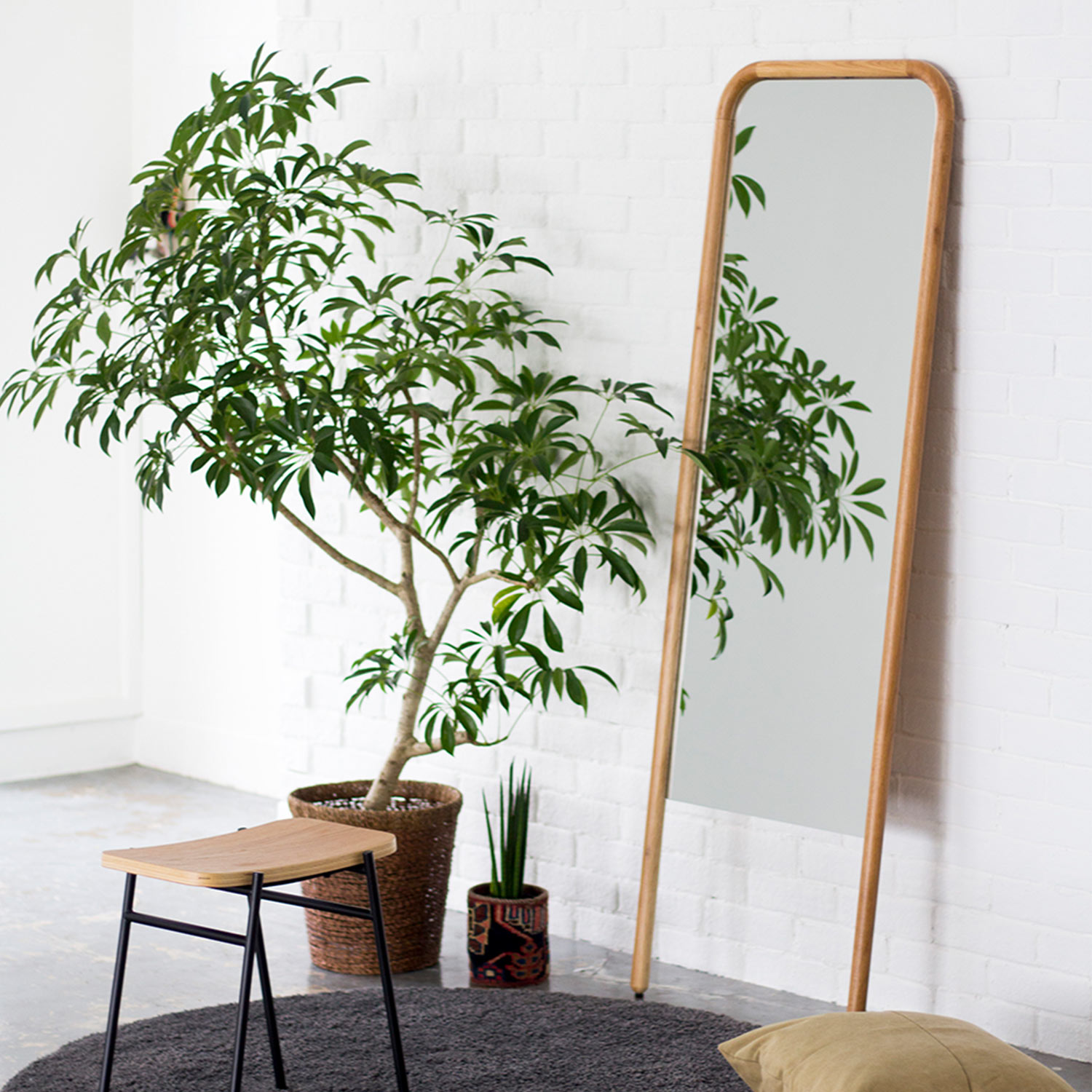 フレームに天然木のオーク材を使用線の細いフレームで全身写せるミラーながら、圧迫感の少ないデザインクリーンでニュートラルな佇まいはインテリアになじみます。幅40cmと幅55cmから