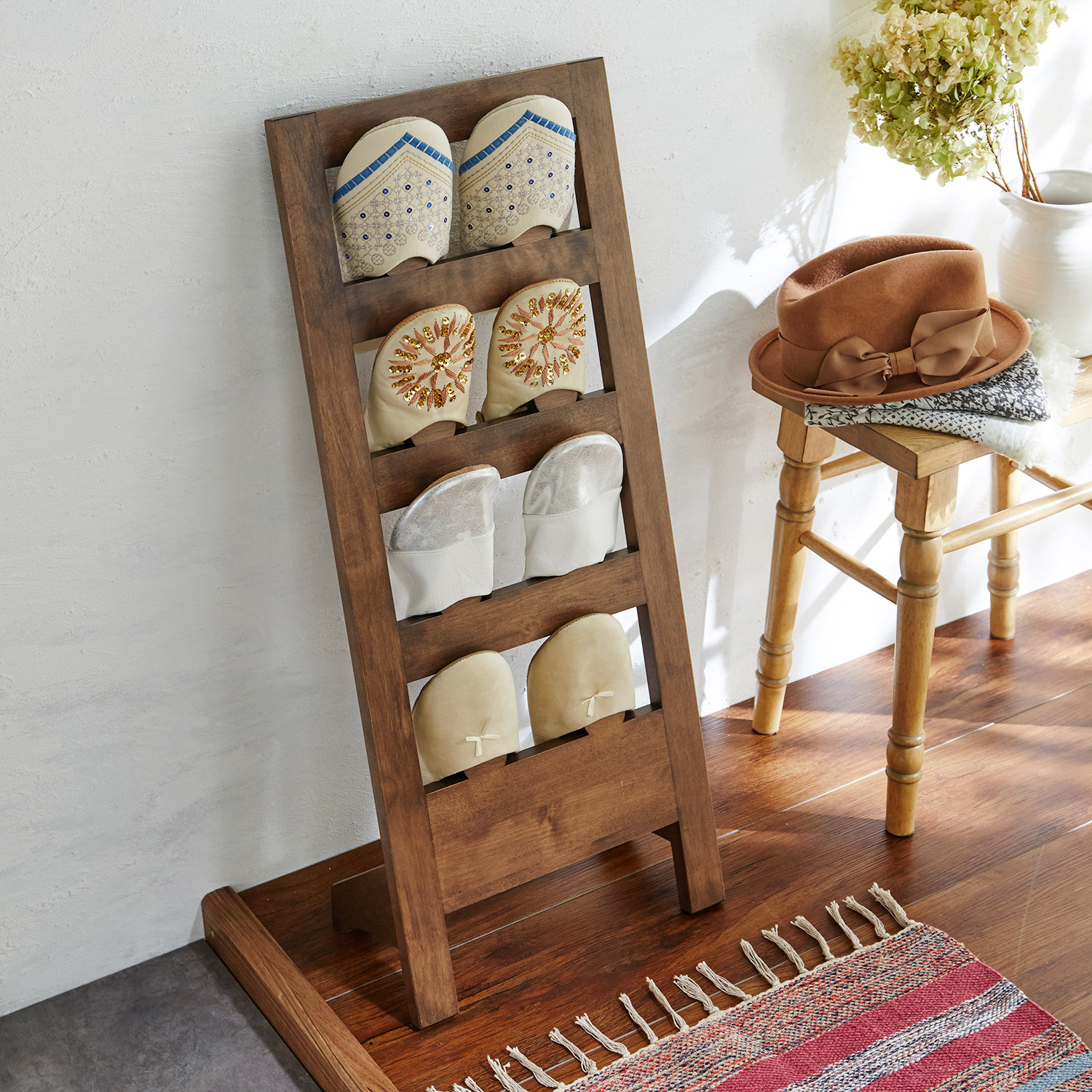 色の濃淡でレトロな雰囲気を見せる、おしゃれなスリッパラックカバ材の木目を生かすシンプルな佇まいは、幅広いテイストのインテリアにしっくりと馴染みます。薄型なので、狭い玄関スペースにも圧迫感なく設置OKスリッパのデザインが映えるつくりは、計4足収納することができます。)