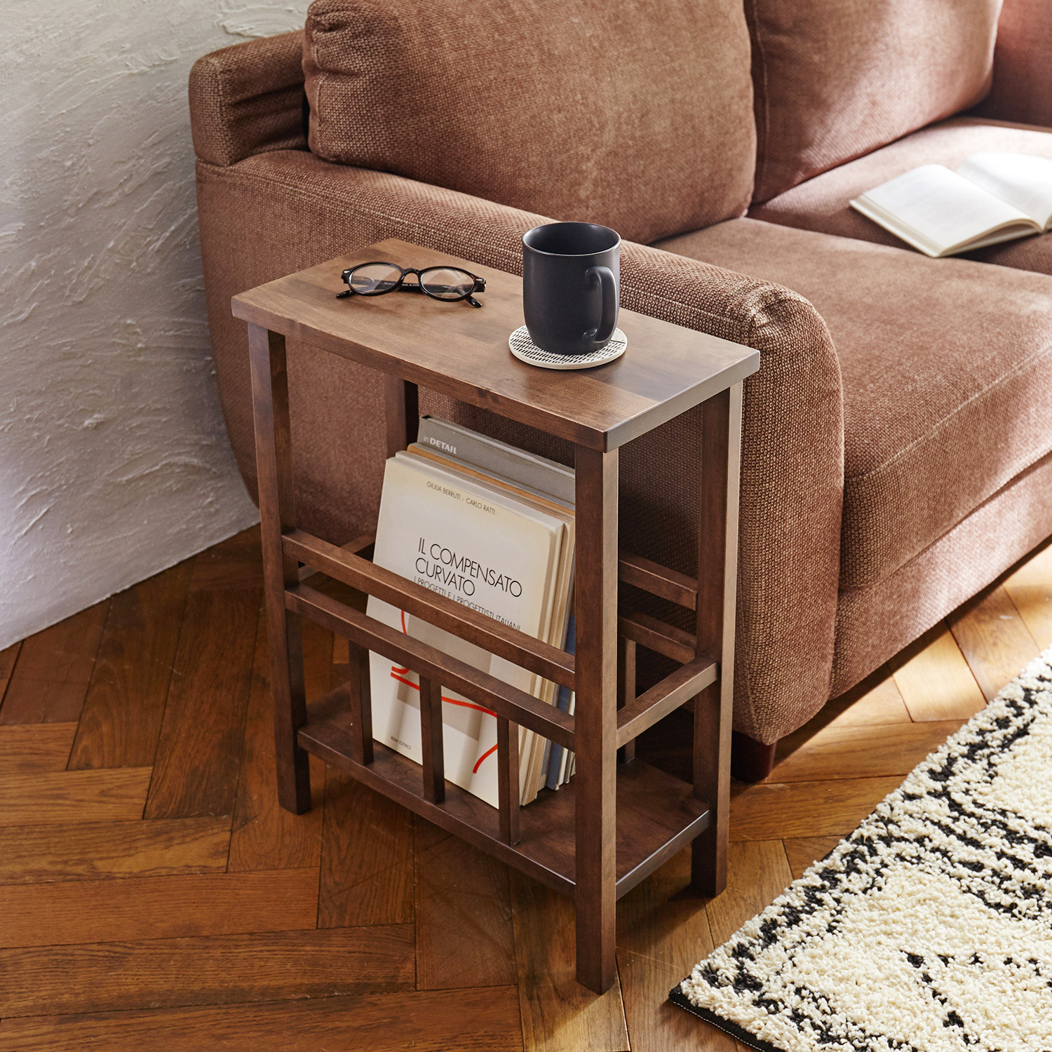 色の濃淡でレトロな雰囲気を見せる、おしゃれなマガジンラックカバ材の木目を生かすシンプルな佇まいは、幅広いインテリアにしっくりと馴染みます。天板はサイドテーブルとしても使え、ソファー横に合わせやすい高さで使い勝手は抜群下段は囲いのあるつくりになっているので、雑誌類をすっきりと収納することができます。)