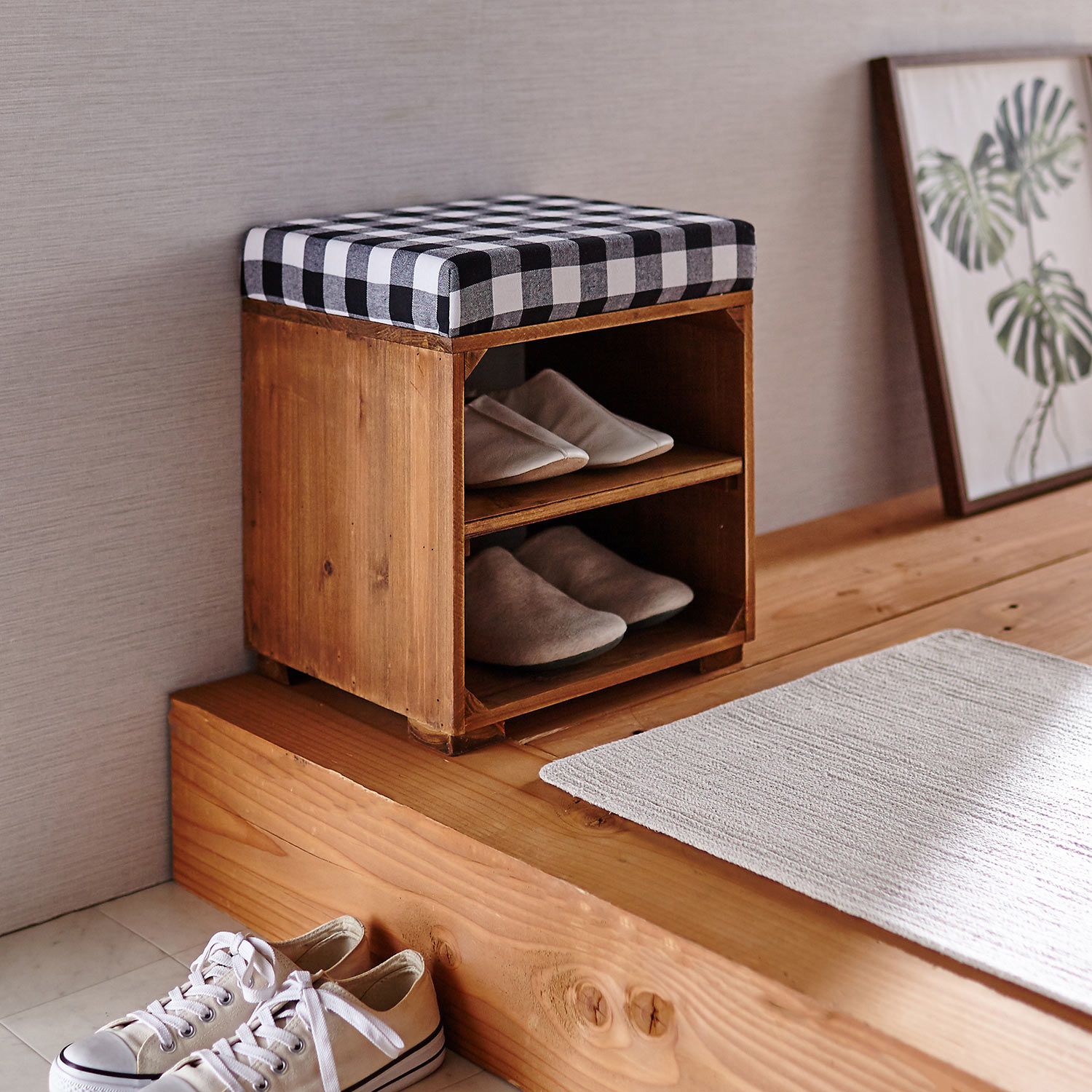 チョイ掛けベンチとしても使える玄関ラック棚板は簡単に取り外しができ、高さのある靴も収納可能ウレタン入りで座り心地も◎天然木フレーム×デザイン座面でインテリア性もGOOD)