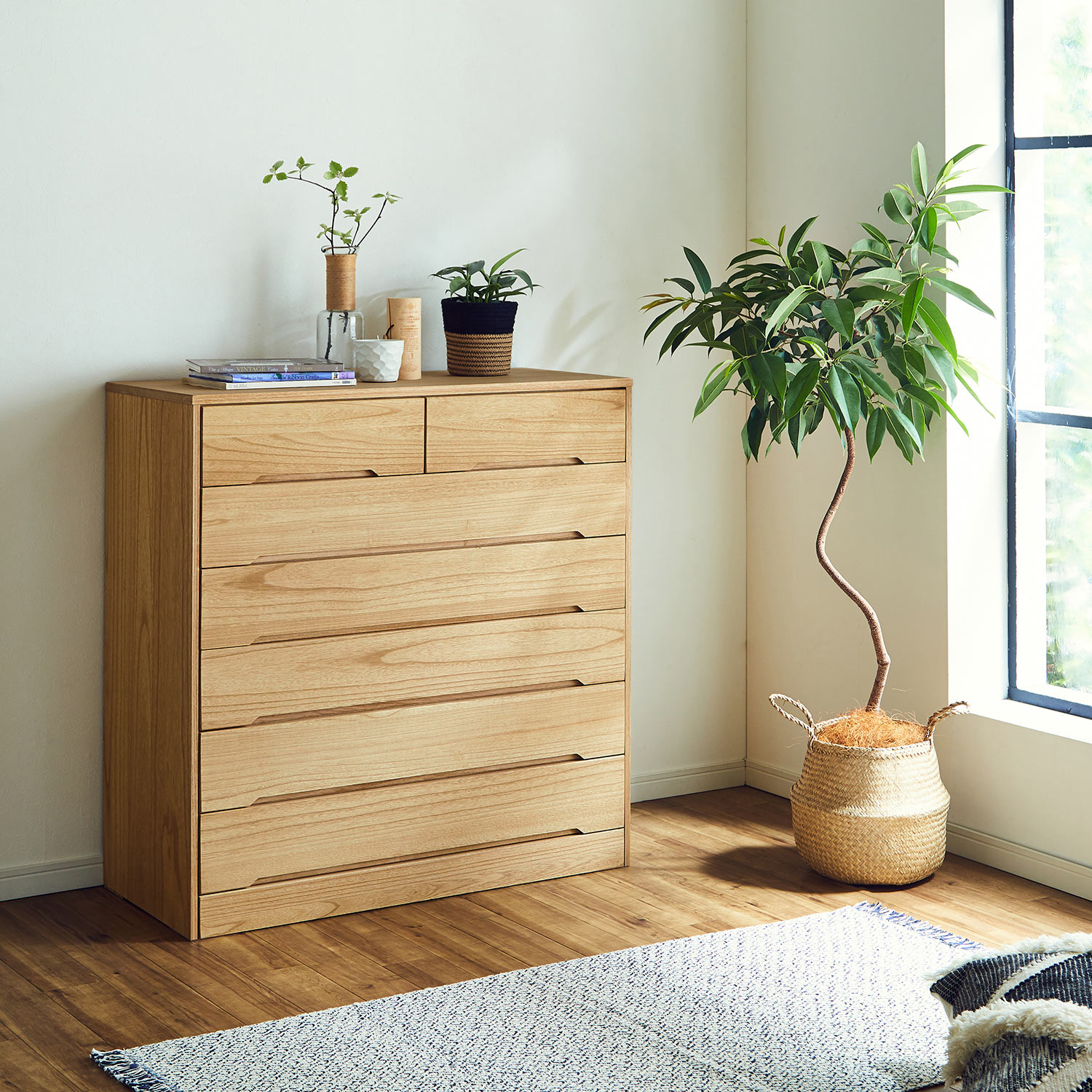 北欧インテリアならではの木の暖かさにオイル加工をプラスすると、ナチュラルカラーのチェストも何となくかっこいい雰囲気に変わります。手触りがしっとりした感じのオイル塗装