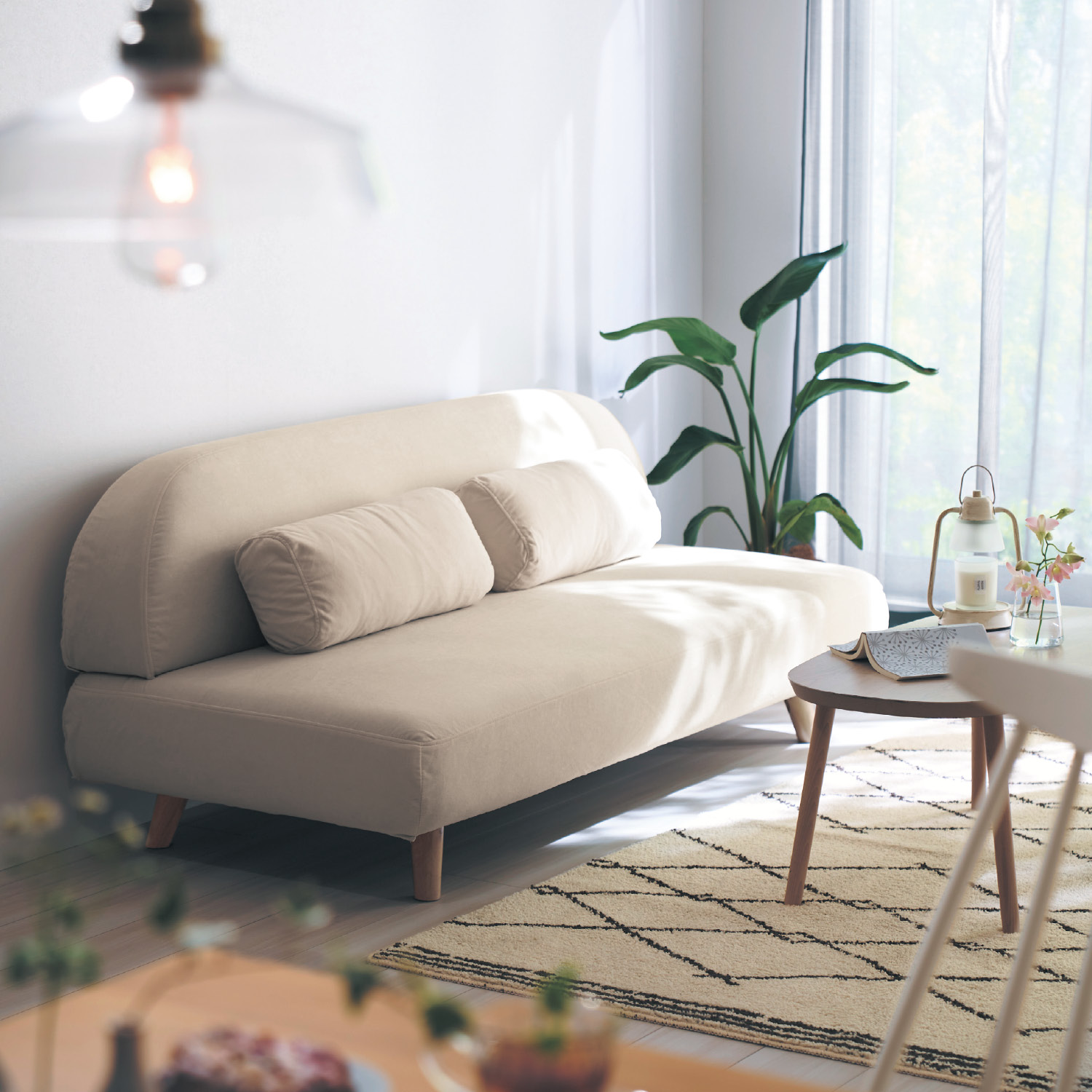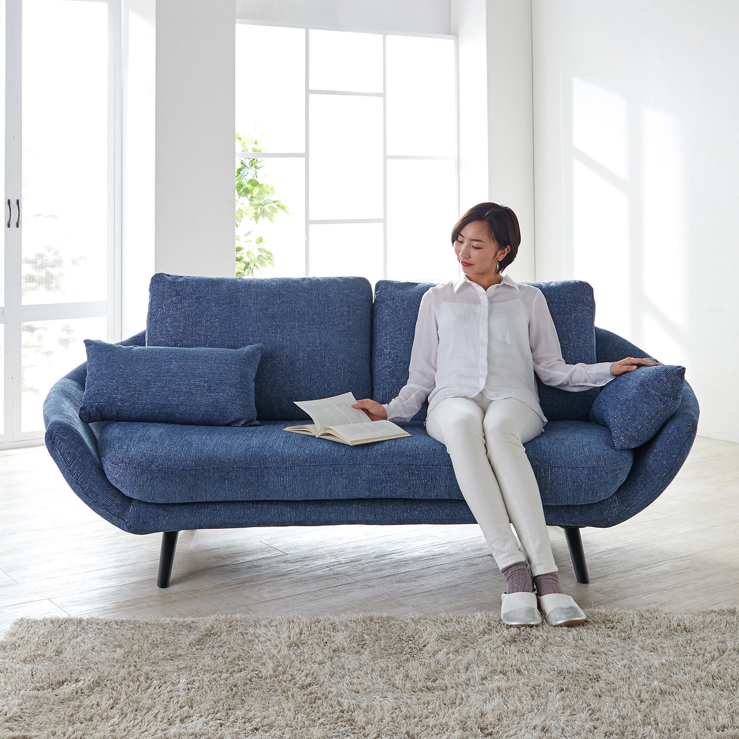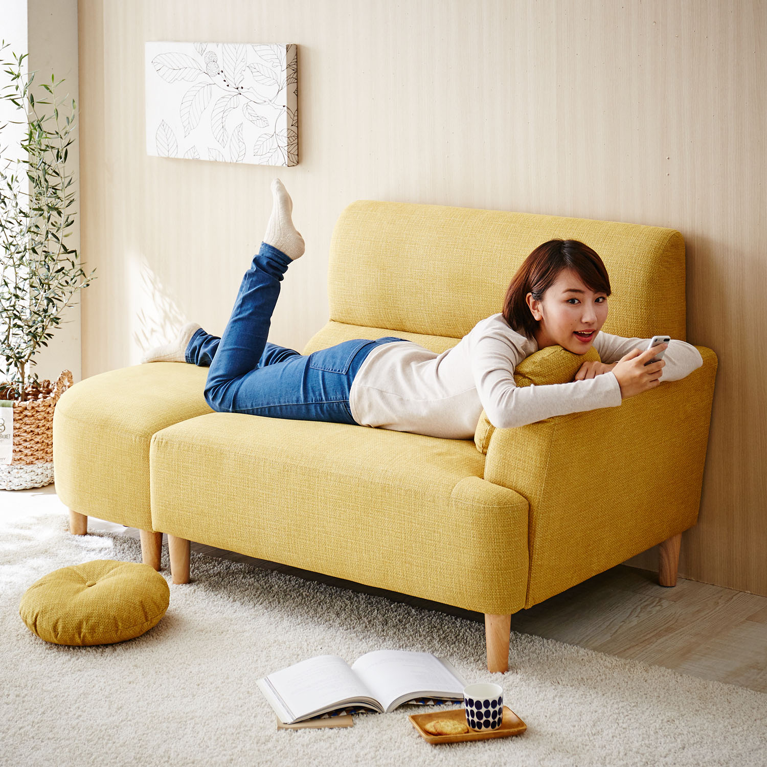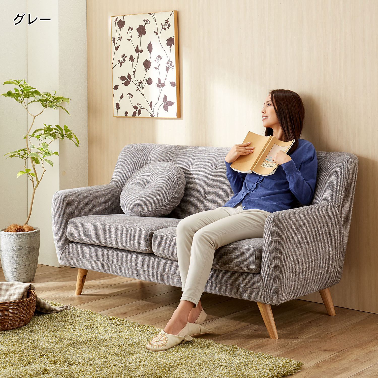 丸みを帯びたフォルムが、空間に柔らかな存在感をプラスちょっと寝ころんでくつろげるサイズながら、サイドの厚みが控えめなので、圧迫感が少なく置けるのも魅力です大小2つずつクッションが付いており、使い方次第で座面の広さも調節可能小さいクッションは肘掛けに使ったり、お昼寝用の枕にしたりと、色んな使い方ができます。クッションはカバーリング仕様なのもうれしいポイント高さ15cmの脚付きで、お掃除ロボもスイスイ入ります。座面は適度な弾力と耐久性がある、S字バネを使用しています。座り心地背もたれはふんわりしたクッション性で、座面は程よいクッション性やフィット感があります。