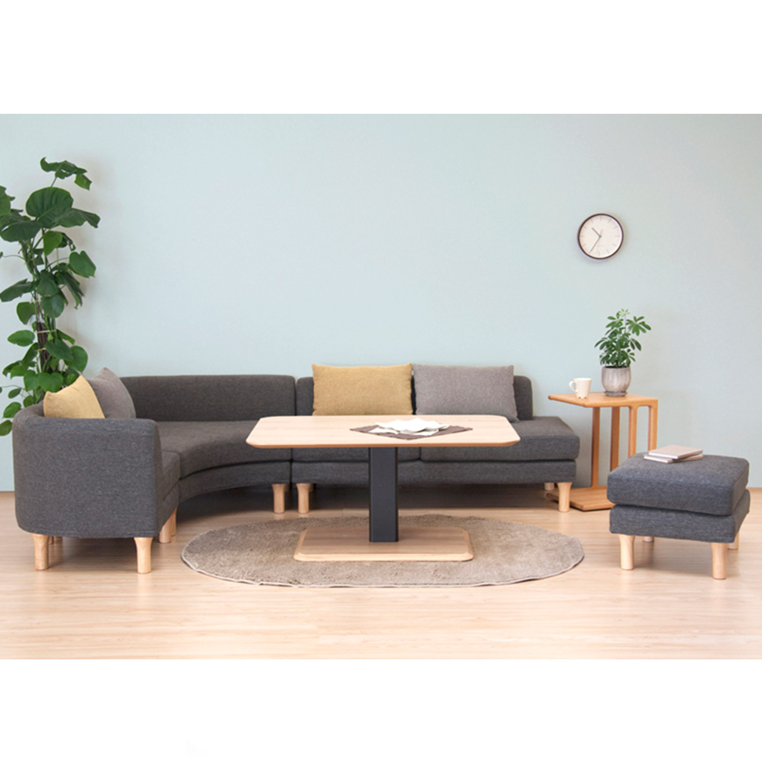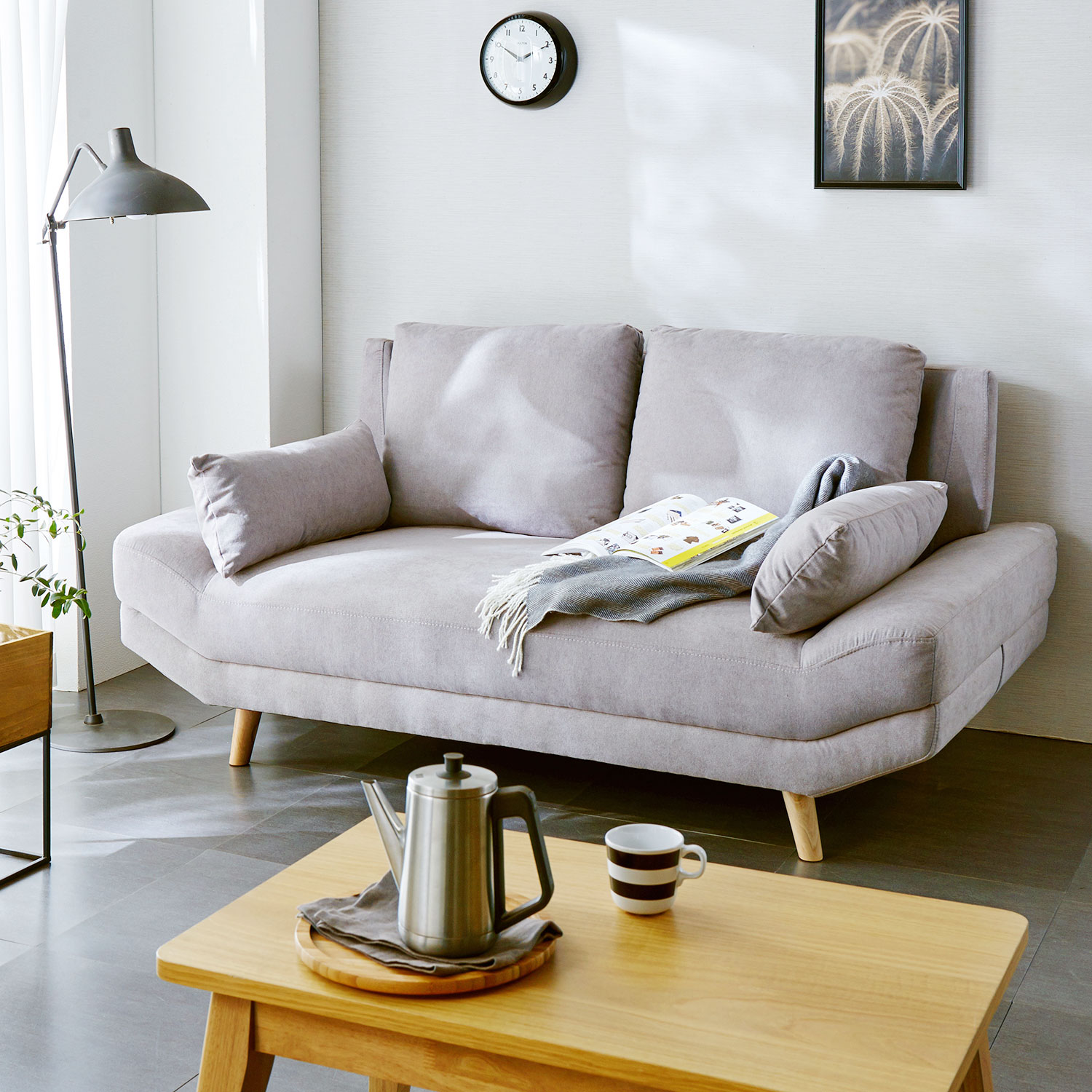 気が付いたら家族が集まっているような、まるでベッドのように寛げる空間を目指しましたフレームに木目の美しい天然木オーク材を使用したソファー背面からみても美しいデザインにこだわりました背面とサイドの木フレームは、すっきりとした抜け感のある繊細なデザインに仕上げています。天然木の美しさと角を落とした丸みのフォルムが特徴です側地はやや起毛がかったやわらかな肌ざわりふんわりとしたシリコンフィルとウレタンフォームを組み合わせた座面はしっかりと身体を受け止めてくれる心地よさ背もたれクッションを移動させれば、デイベッドのように横になって過ごすことも背クッション・座クッションともにカバーリング仕様なので、汚れても洗濯機で洗えていつでも清潔脚部の高さは16cmあるので、自動掃除機も通れます