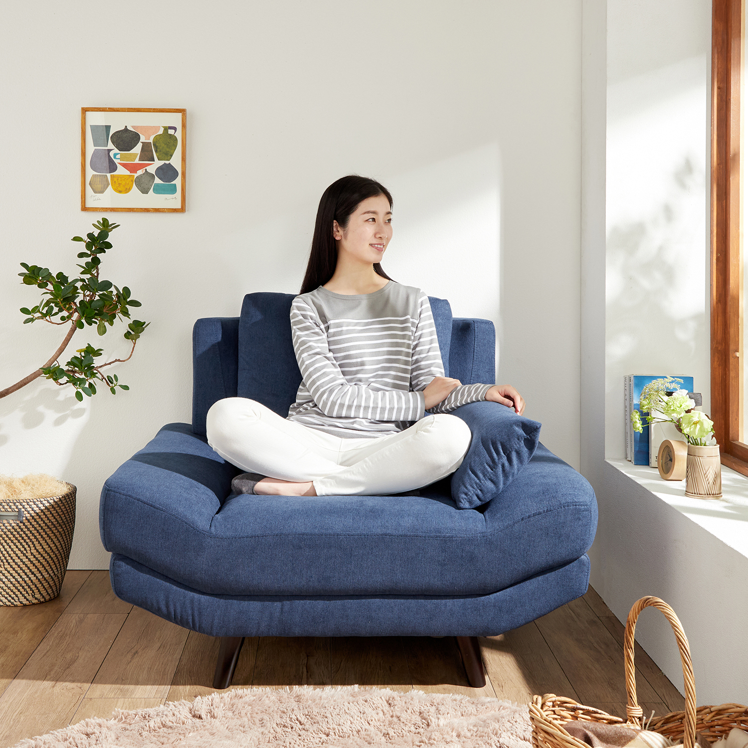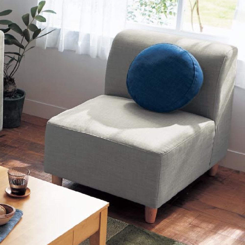 ひじ部分がないので広々として使え、あぐらをかいたり、寝転んだり、いろんなスタイルでゆったりくつろげます。付属のクッションを枕代わりに置いて、脚を伸ばしてもOK背もたれ部分の角に丸みをつけて、やわらかな印象に北欧テイストやナチュラルテイストのお部屋にも合わせやすいデザインですインテリアとなじみやすいカラーをご用意しましたグレー、アイボリーはライトカラーの脚部、ネイビー、ダークブラウン、ダークグレーはダークな木色の脚部を合わせ、細部にもこだわり