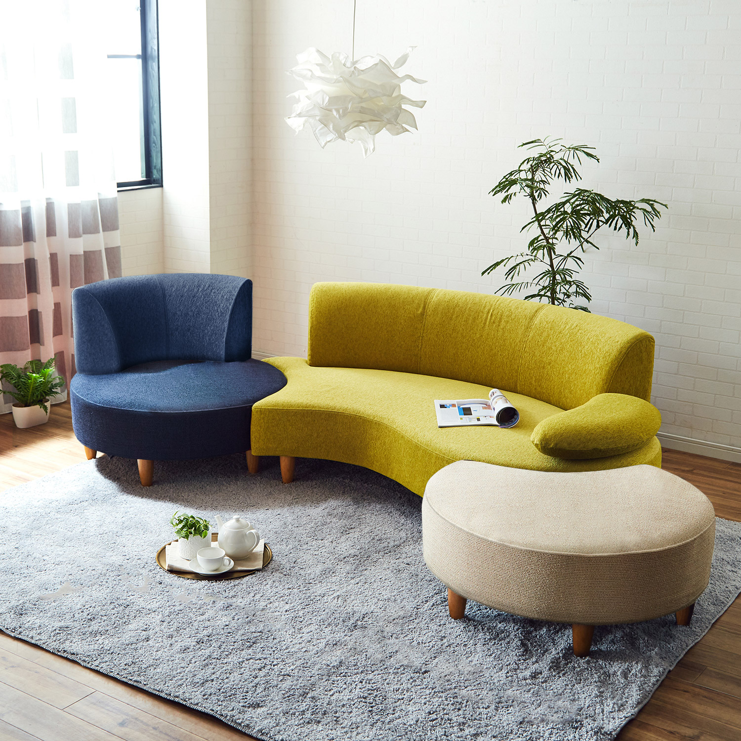 ペットの引っかき傷に強い張地を使用した、シンプルデザインのソファーウレタンをたっぷりと入れているので、座り心地は快適です半円型のオットマンはサイドに付けたり、前面に付けたりと、使い勝手に合わせて組み替えOKインテリアのアクセントになる「イエロー」「グリーン」と、男前なお部屋に馴染む「ダークブルー」、ナチュラルな印象の「ライトブラウン」の4色から、お好みでどうぞ丸みのあるクッション2個付き座り心地背もたれ・座面ともに程よいクッション性やフィット感があります。