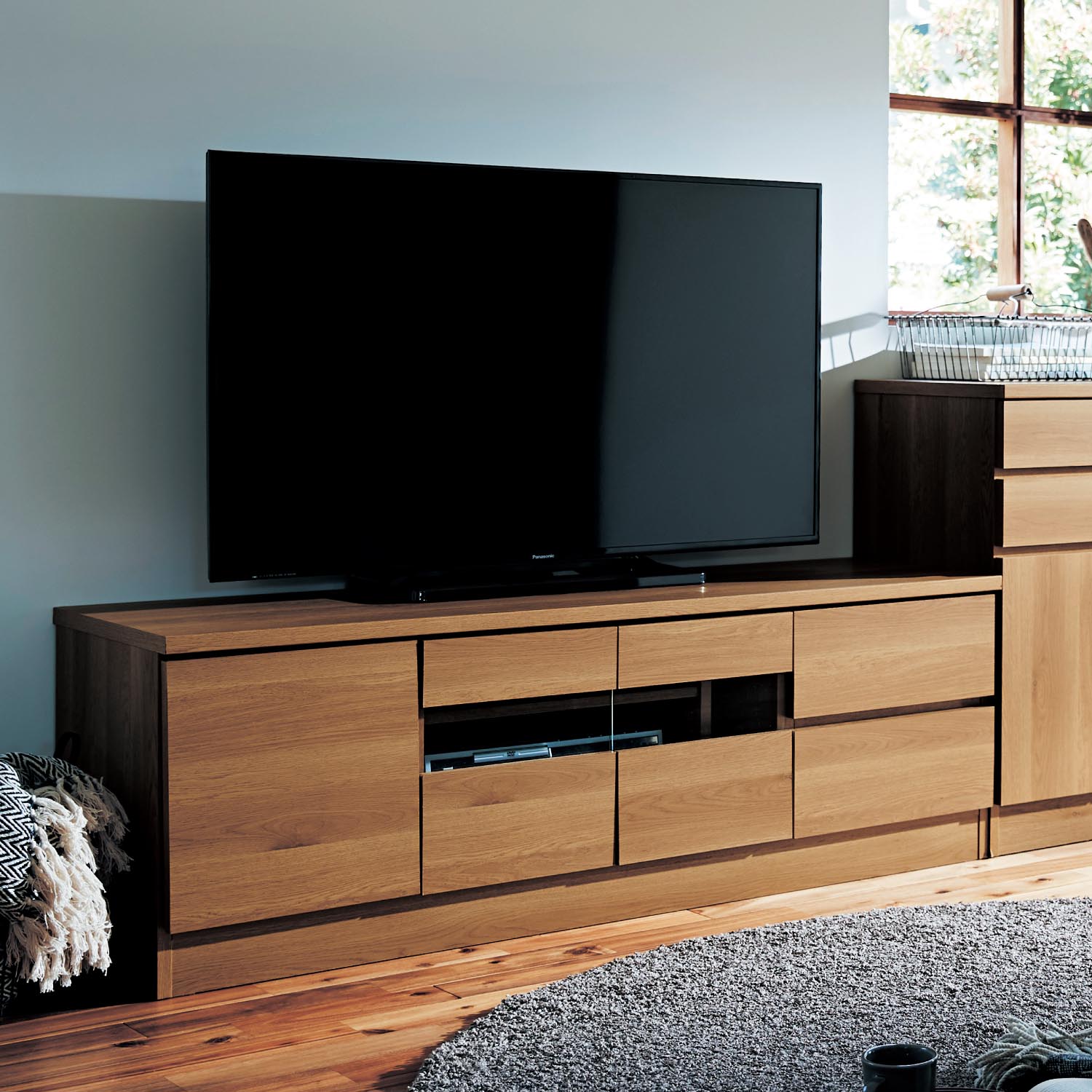 テレビより大きい幅のテレビ台で台形バランスをつくれば、テレビまわりの空間が美しく整います)