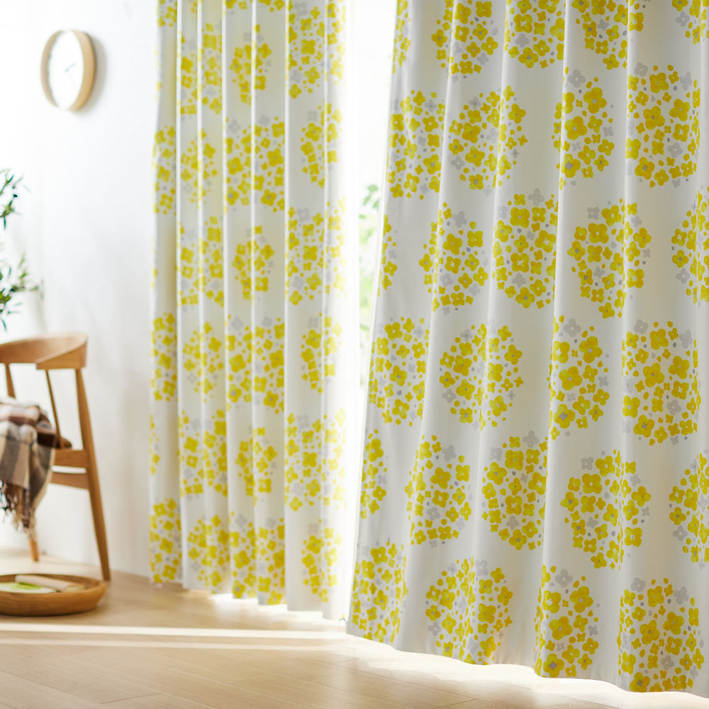 小花を丸く集めてブーケのようなイメージにプリントしています。明るいイエロー色と落ち着いたサーモンピンクの2色展開裏面の樹脂加工で外光をしっかり遮断します。遮熱効果で冷暖房の効率を高めます。
