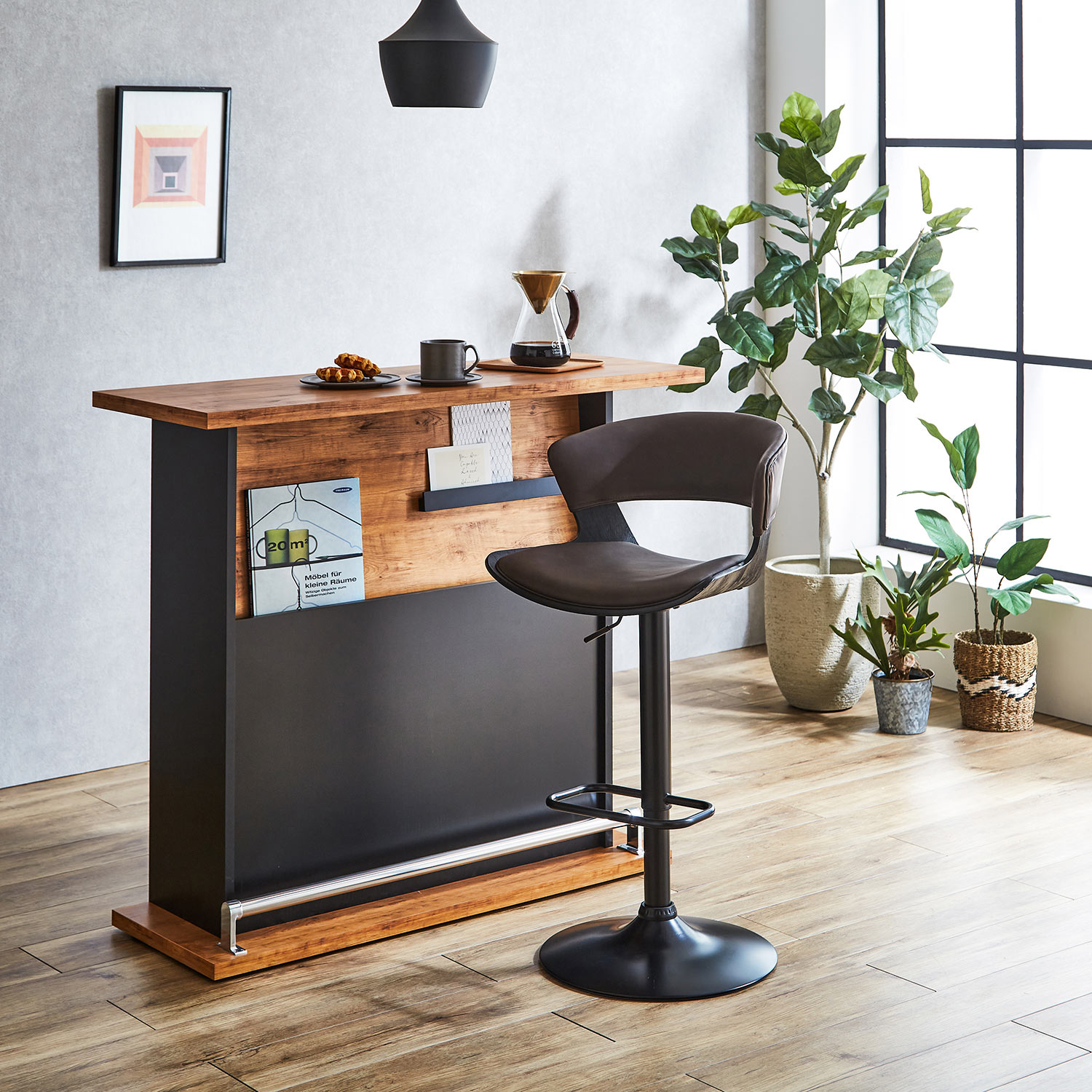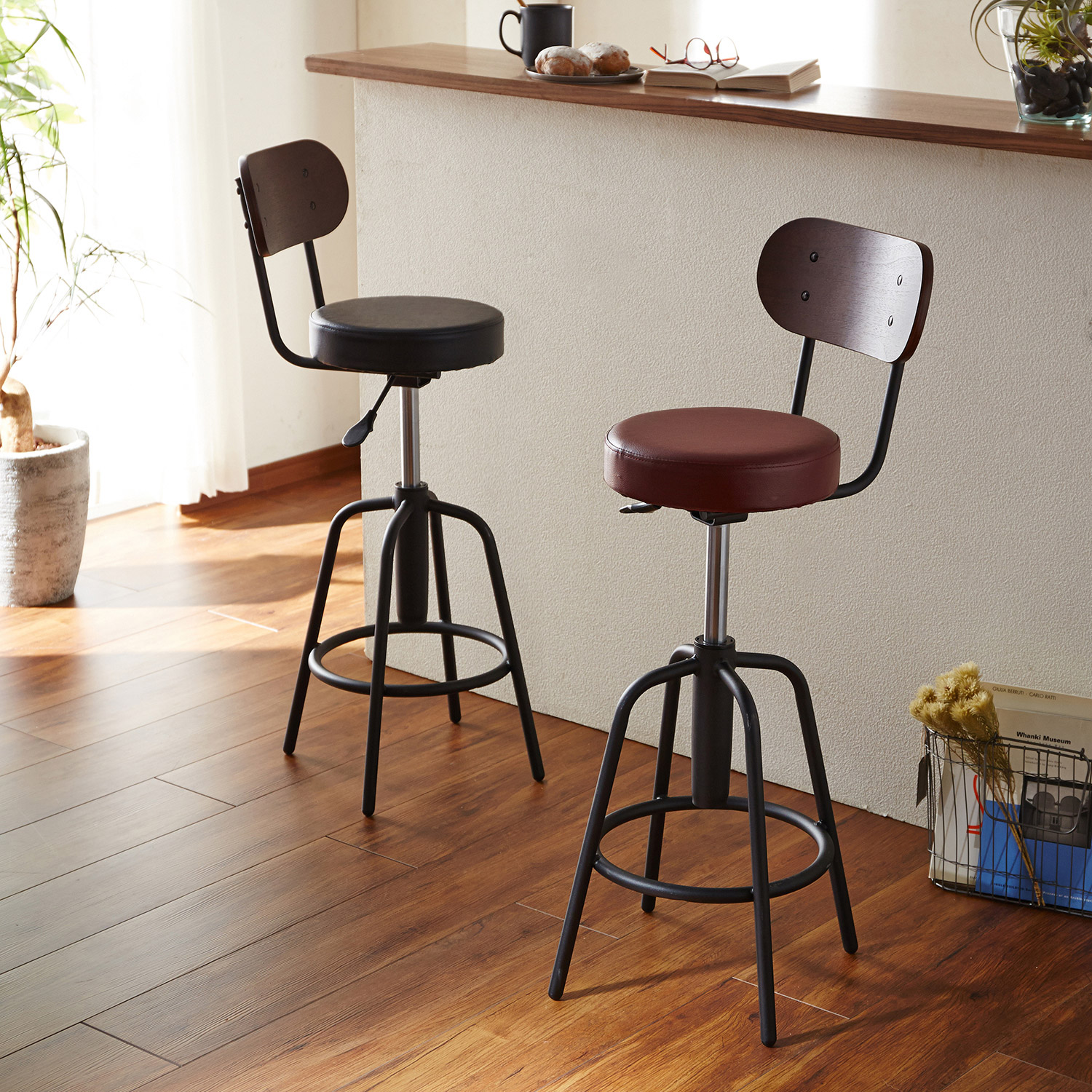 小粋なデザインが魅力的なコンパクトなカウンターチェアです背もたれはウォルナット材、フレームにはつや消しのブラックで塗装したスチールを使用し、異素材をバランスよく組み合わたデザインが魅力です座面はコンパクトながら、ウレタンフォームで程よいクッション性を備えています。座面の高さは、61cm~71cmまで調節可能合皮素材の張地を使用した座面のカラーはブラック、グリーン、ワインレッドから