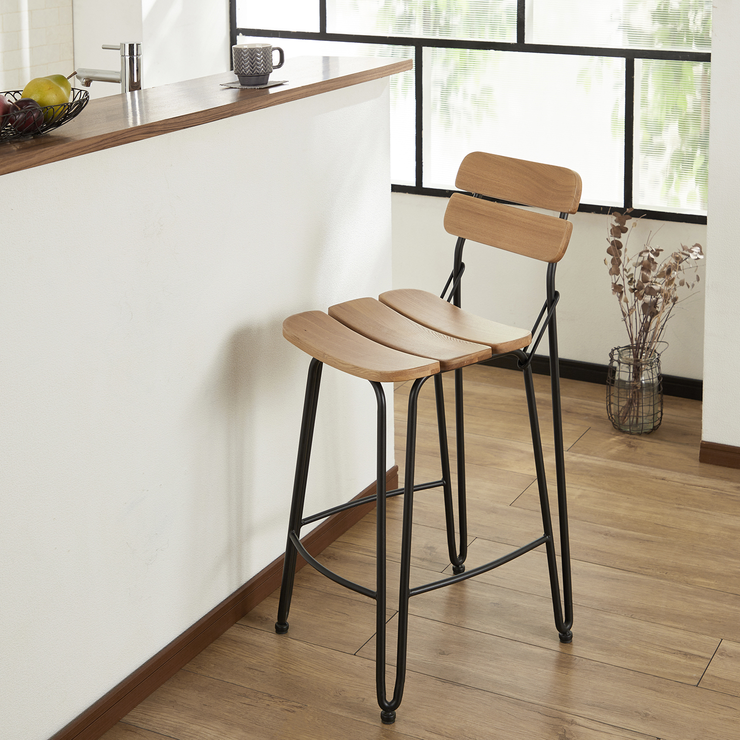 ブラックカラーのスチール脚と天然木の組み合わせが印象的なハイチェア背もたれや座面など、身体に触れる部分には天然木を使用しているので使用感も◎足掛けもついているので、安定してお座りいただけます。