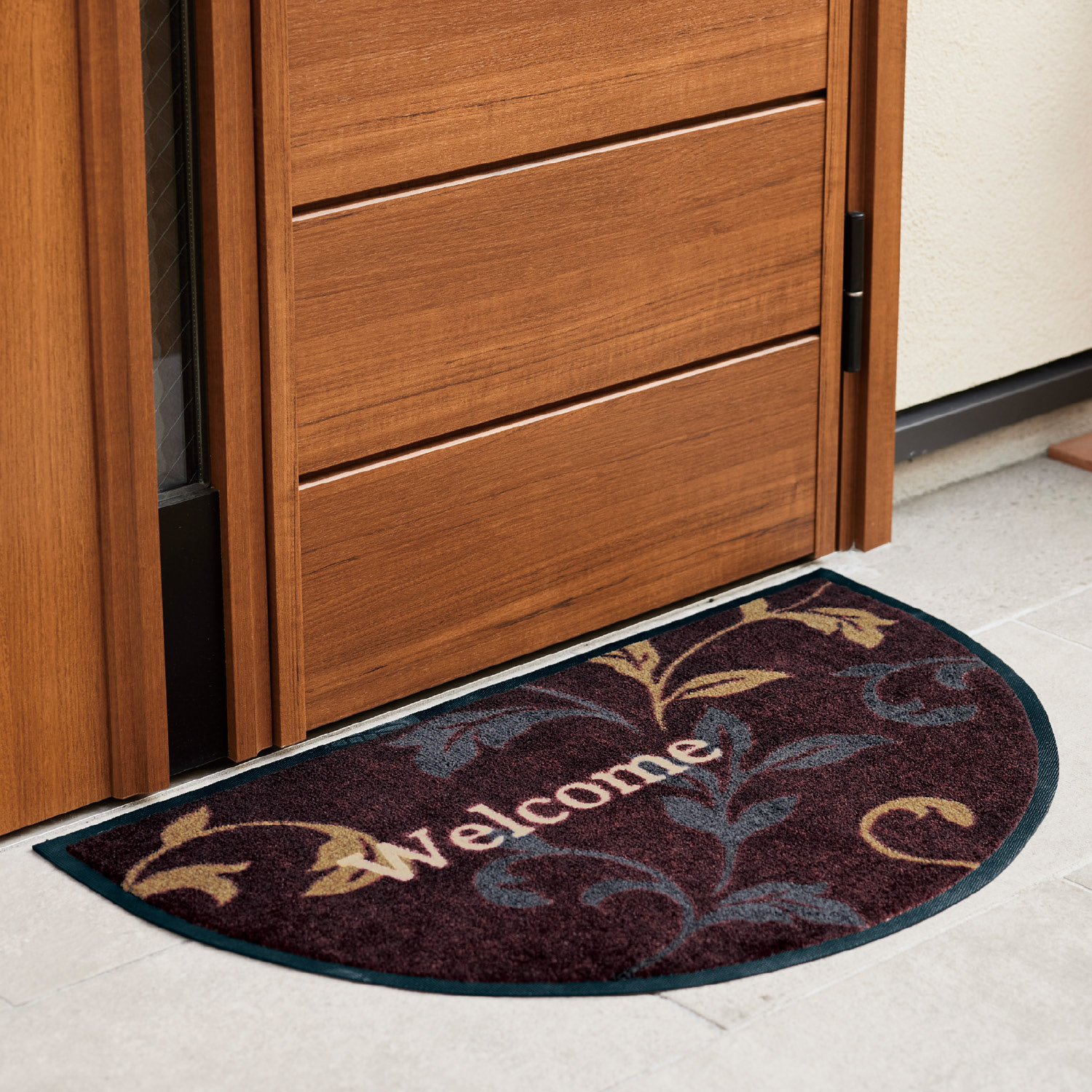 やさしくエレガントなデザインで仕上げた半円型の玄関マット。-デザイン-・シックなカラーで落ち着いた印象・ナチュラルなデザインにシンプルなロゴがポイント・ドアを開け閉めした時に引っかかりにくい薄手仕上げ-素材-・耐久性のあるナイロン製で、靴底についた泥を落とせます。・汚れても水で洗い流せるのでお手入れ簡単)