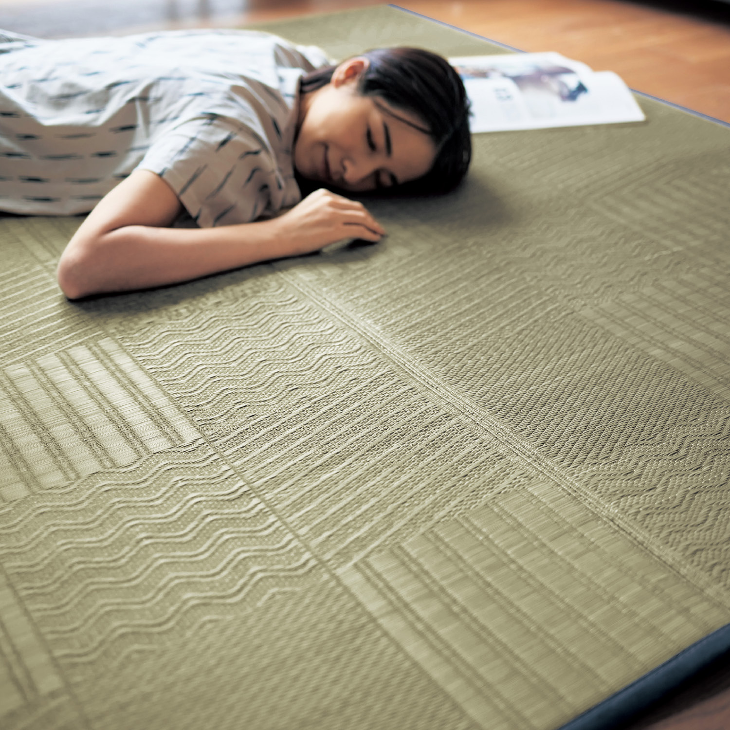 折れにくくしっかりとした日本製い草を使用丈夫ない草を使っているので、きれいな仕上がり通常行われる「泥染め」というコーティング作業や染色をせず、自然なままのい草い草そのものの香りや手ざわり通常のものよりやわらかくしなやかで、つるつるの手ざわりと落ち着いた自然な色合い敷いた時の美しさを考えて、繊細な織り柄を表現ヘムにもこだわり、「市松柄」にはグレー色のさらりとした綿麻素材を、「幾何柄」にはキナリ色の麻素材を使用し上質感を演出