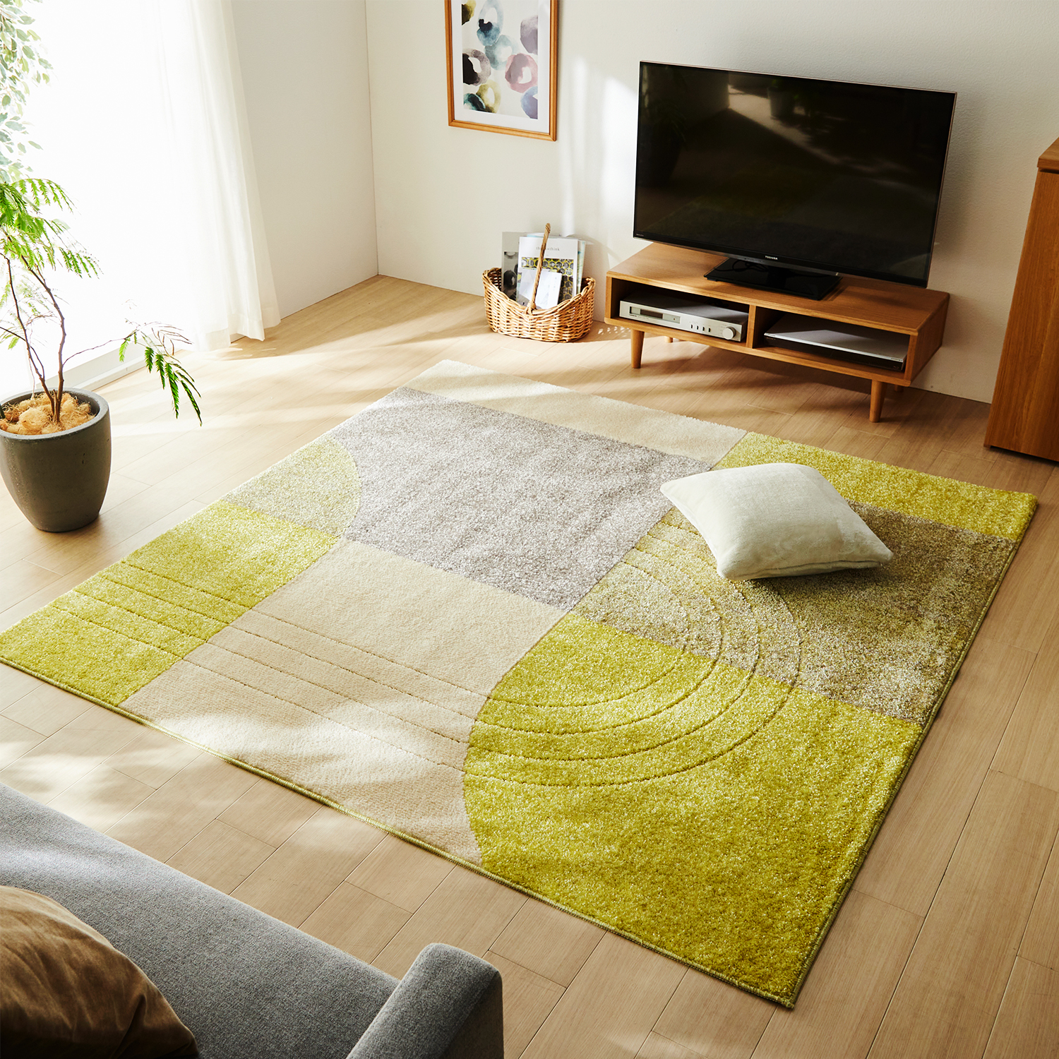 アールをアクセントにしたシンプルな幾何学柄のラグですカジュアルな明るいカラーでお部屋を楽しく彩ります。汚れたら手洗いOK地色のアイボリーがさらりとした手触りのポリプロピレン糸、各カラー部分が高耐久で滑らかなナイロン糸を使用小さなお子様がいるご家庭にも安心の防ダニ機能付き肌触りも良く、ホットカーペットカバーとしても使用でき、一年を通して快適にご使用いただけます。