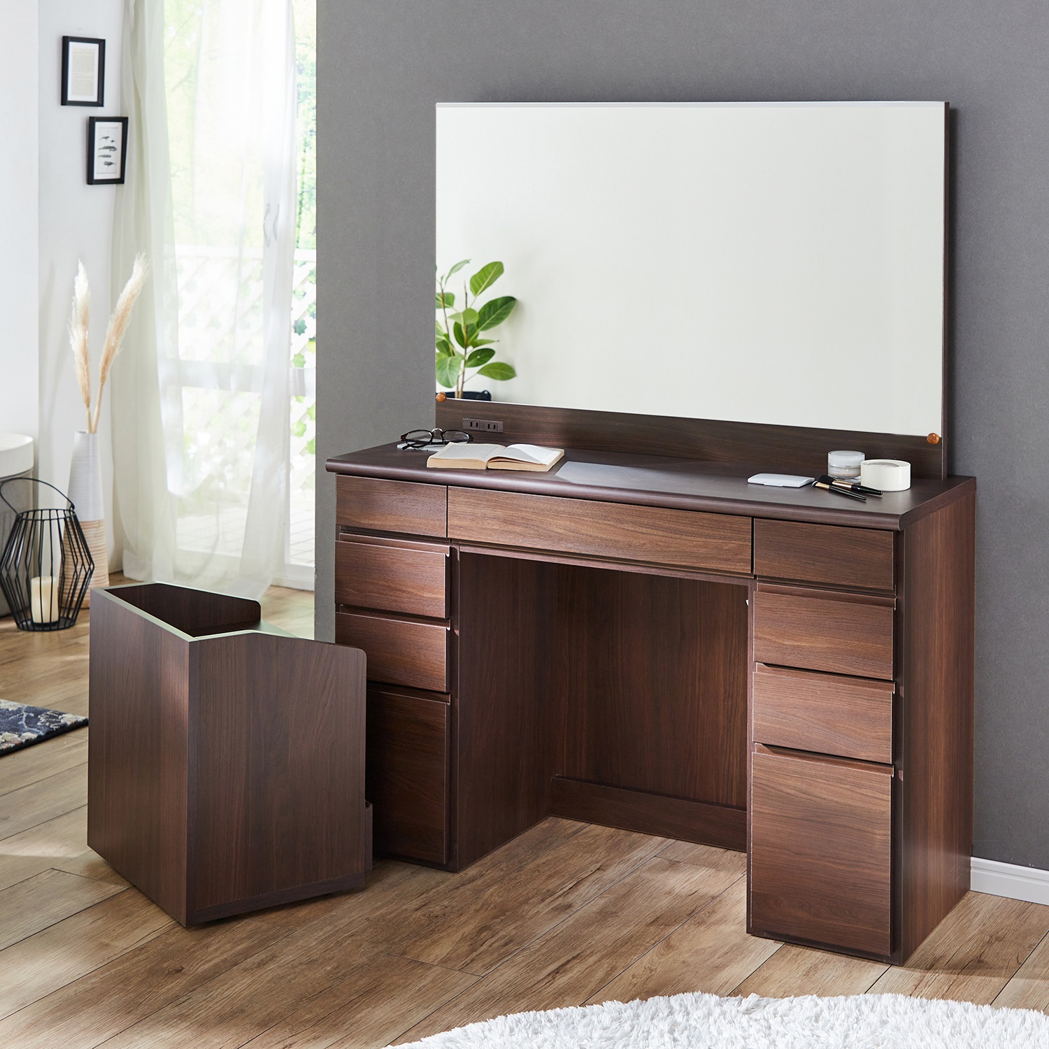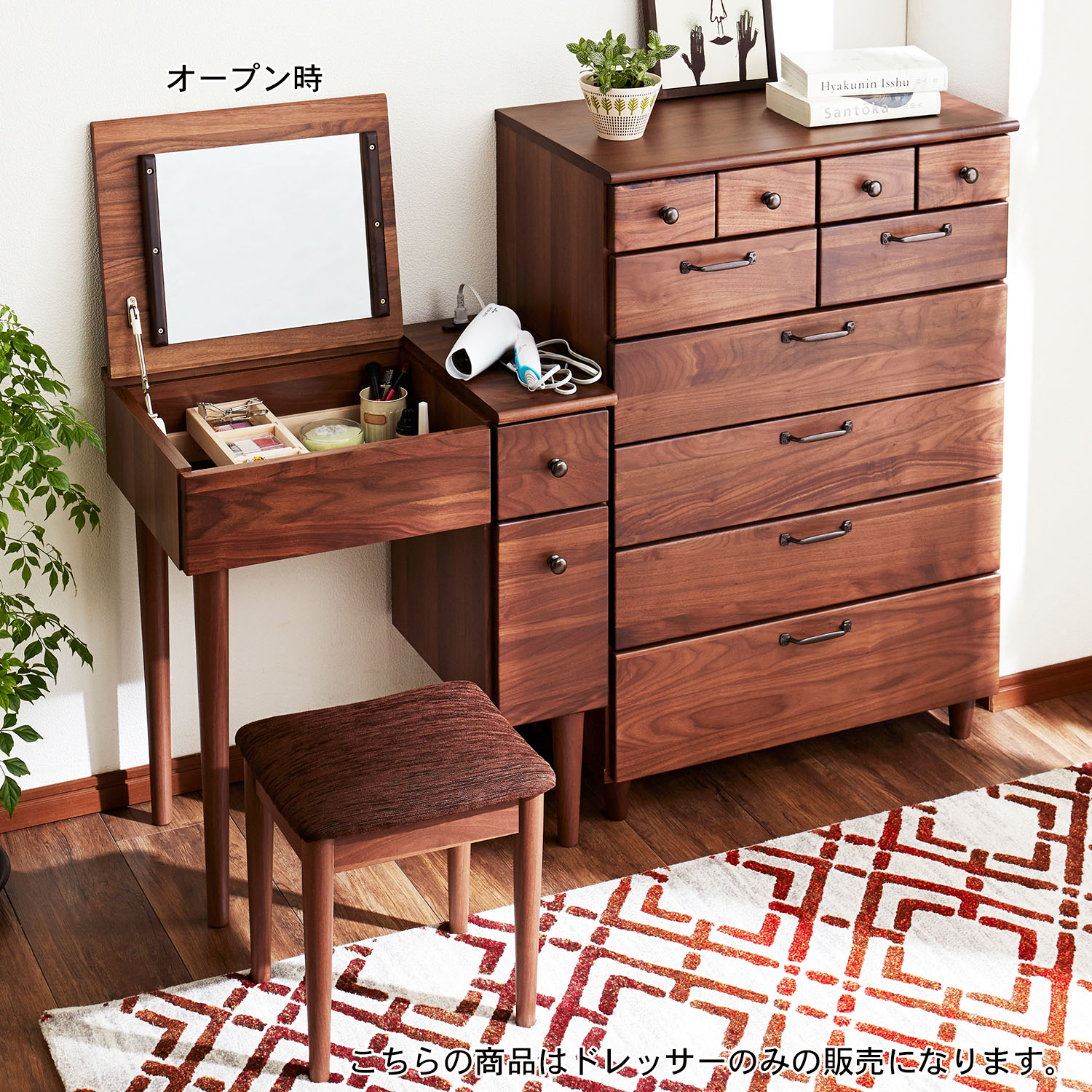 味わい深く美しい表情の天然木ウォルナット材を贅沢に使用したドレッサースツールがセット